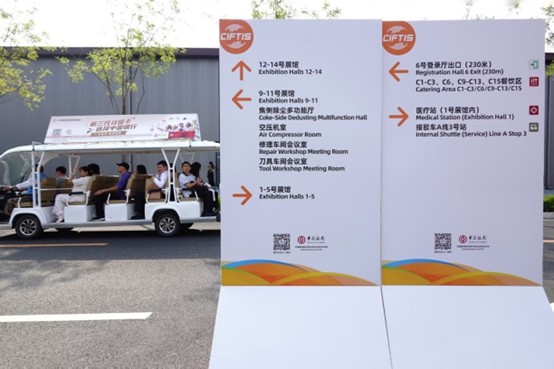 首都会展(集团)有限公司作为承办单位之一,在运营服务保障方面、完善和升级园区抵离、动线规划、智能提示。增加登录厅数量,设置便捷出入口。园区内外设置免费摆渡车、观光车及电瓶车线路,站点串联配套活动、停车场等目的地,首次推出场馆人流数据监测、电瓶车智能报站、停车场导航及容量查看等服务。