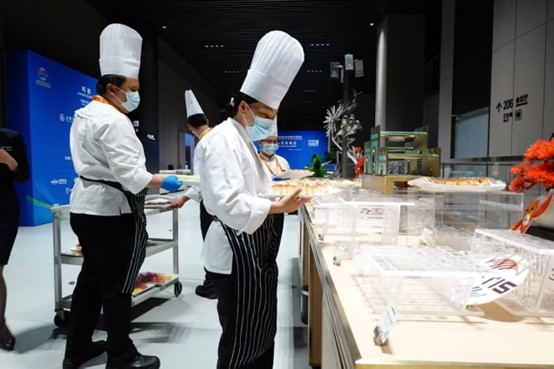 全球服务贸易峰会茶歇由国家会议中心提供茶歇外卖至首钢会展中心,为确保食品新鲜,国家会议中心自当天0点统一制作, 8:30客人品尝到茶歇,9个小时完成茶歇从制作到客人享用。会场总计为700余名参会嘉宾提供茶歇服务。同时,北辰集团统筹安排,抽调旗下国家会议中心66名服务人员保障峰会,带来物资4000余件保障峰会圆满举行。