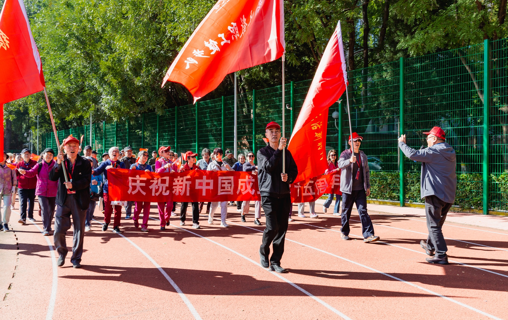 活动当天,阳光明媚,学校操场上人声鼎沸,彩旗飘扬。上午10时整,随着一声整齐的号令,集体健步走活动正式拉开帷幕。老同志们贴着统一的国庆图标,脸上满是自豪与喜悦,他们随着激昂的红歌旋律,手举红旗,迈着坚定的步伐,沿着操场缓缓前行,每一步都踏出了对过往岁月的深情,每次摆动都舞出了对新时代的美好憧憬,他们用这份独有的方式来表达自己对祖国的深情祝福与无限热爱。