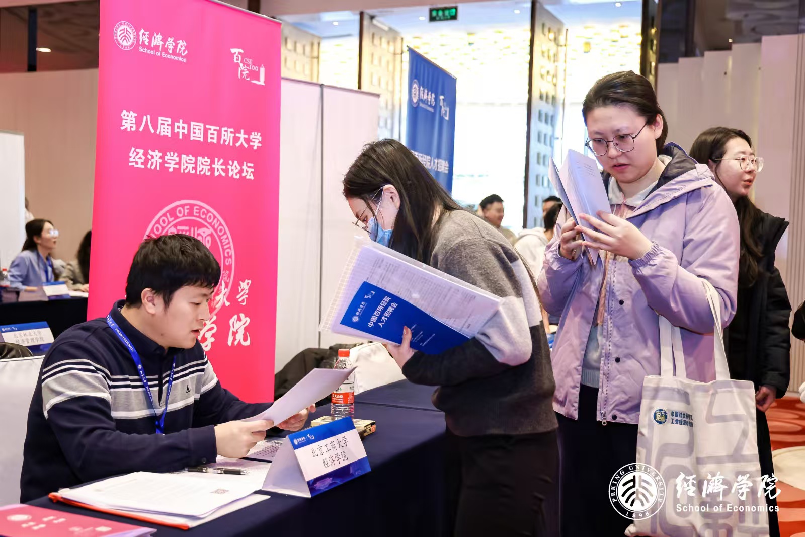 12月13日下午,论坛在北大博雅国际酒店举办“百所经院人才招聘会”。招聘会吸引了海内外3000余名博士生参加,他们与来自全国130所高校及科研机构的招聘单位负责人进行了面对面深度洽谈。北京工商大学经济学院党政办公室主任张旭吟应邀参加本次招聘会,与来自北京大学、清华大学、中国人民大学等高校的博士毕业生和博士后进行了全面接洽,并收到国内外名校优秀应聘者的简历80余份。