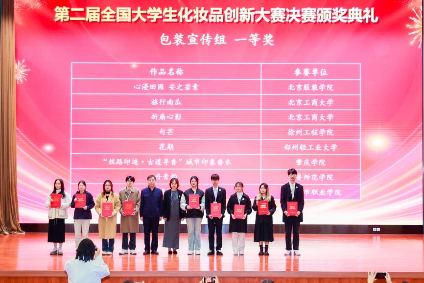 11月2日举办第二届全国大学生化妆品创新大赛决赛颁奖典礼。学校党委常委、副校长郑文红,山东花物堂生物科技有限公司总经理亓丰伟,广州环亚化妆品科技有限公司美肤宝线下营销渠道总经理朱晓宏,知名成分党博主江彪分别致辞。王万绪、董银卯、暨南大学生命科学技术学院院长白卫滨、大赛组委会成员、决赛评审专家以及行业企业领导、专家、高校教师、学生代表均参加大会。颁奖典礼由学校轻工科学与工程学院党委书记姚志良主持。