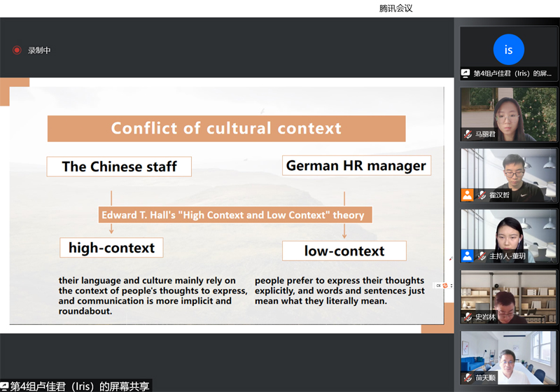 在正式比赛过程中,同学们结合自己的跨文化交际体验,现场展示和分析了跨文化交流案例,各个参赛小组分别从不同的领域作为切入点,如商业贸易,学习生活,医学药理,电影艺术等,深刻剖析了中外语言文化差异,分享在跨文化视角下发现问题和解决问题的经历与经验。各组参赛同学均以原创视频入赛,进一步增加了我校学生对跨文化交流的认知与理解。在问答环节,针对评委老师的提问,同学们准确进行回答,并对回答内容积极补充,获得了评委老师的肯定与赞赏。