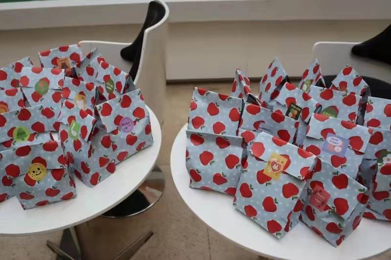 在考研学子们仍在抓紧最后的时光紧张复习之际,商学院心资部的同学们早早来到商楼大厅为家庭经济困难的考研学子们精心准备小礼袋。画满红苹果的蓝白相间小礼袋里装着又大又红的苹果和一张满载着祝福语的卡片。苹果有着放“苹”心态、“苹”稳上岸、一定能“果”线的寓意,寄托着学弟学妹们对考研学子的祝福;卡片上写有大家精心准备的鼓励话语,言语间希望这些考研的学长学姐们能摘取胜利的桂冠,不负过去伏案桌前、泛舟书海的自己。