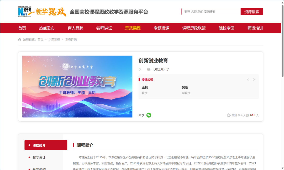 思政课是落实立德树人的关键课程。“新华思政”是依托新华网建立的全国高校课程思政教学资源服务平台,通过发挥平台优势,面向全社会开放共享,为广大高校教师提供课程思政展示、先进经验学习、交流和优质思政教育资源的共享。自2020年2月开通以来,“新华思政”汇聚了丰富的国家级、省级、校级示范课程及配套教学资源,为高校课程思政改革创新提供了可借鉴的示范和引领。