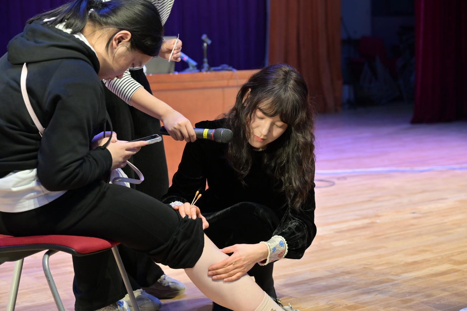讲座现场,何医师还邀请了两位同学分别现场体验了耳朵穴位针灸和火龙罐两种中医外治疗法,现场同学们都热情踊跃地参与互动环节。