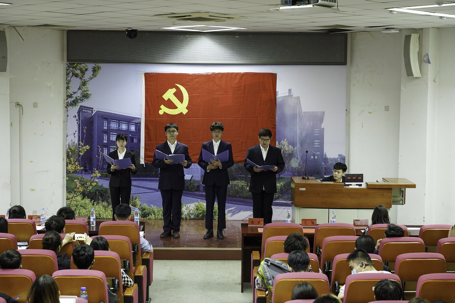 朗诵的同学身着正装、站姿挺拔,满含对党和祖国深深的热爱,将自己最饱满的热情投入到朗诵的诗歌当中。随着诗句的起伏波折,同学们的声音也抑扬顿挫,声情并茂,时而铿锵有力,时而婉转悠扬,歌颂那最为和谐优美而又锋锐有力的赞歌,将曲曲赞歌赠予我们伟大的党和祖国,给同学们带来了一场听觉的盛宴,台下发出阵阵热烈的掌声。