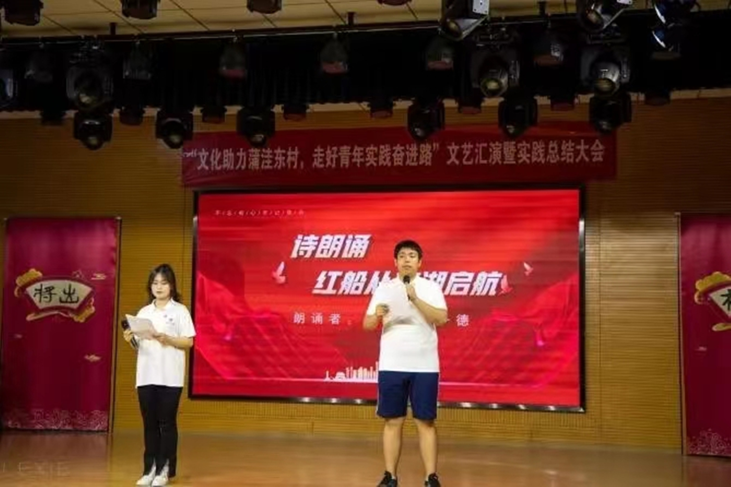 实践团学生结合当地文化背景,将传承优秀传统文化与弘扬红色革命文化紧紧联系在一起,献唱《稻香》,诗朗诵《红船,从南湖起航》,编排舞台剧《归途有风》,重新打开时间的原点,回望过去蒲洼东村发展历程。蒲洼村的乡亲们热情展示当地特色节目,老艺术家们带来山梆子戏、小调,民间艺术团带来扭秧歌,乡亲们献唱《欢聚一堂》《咱老百姓》等经典歌曲,通过朴实无华的歌词勾勒出鸟语花香、风调雨顺、情深谊长的美好景象,展望未来美好蓝图。