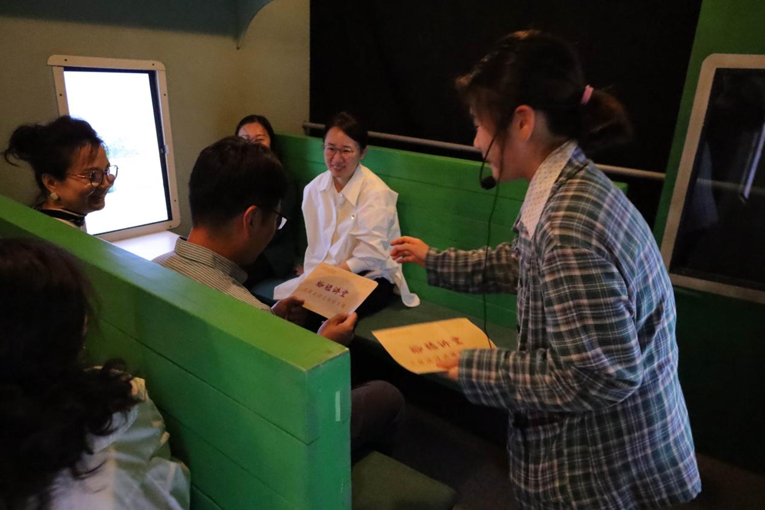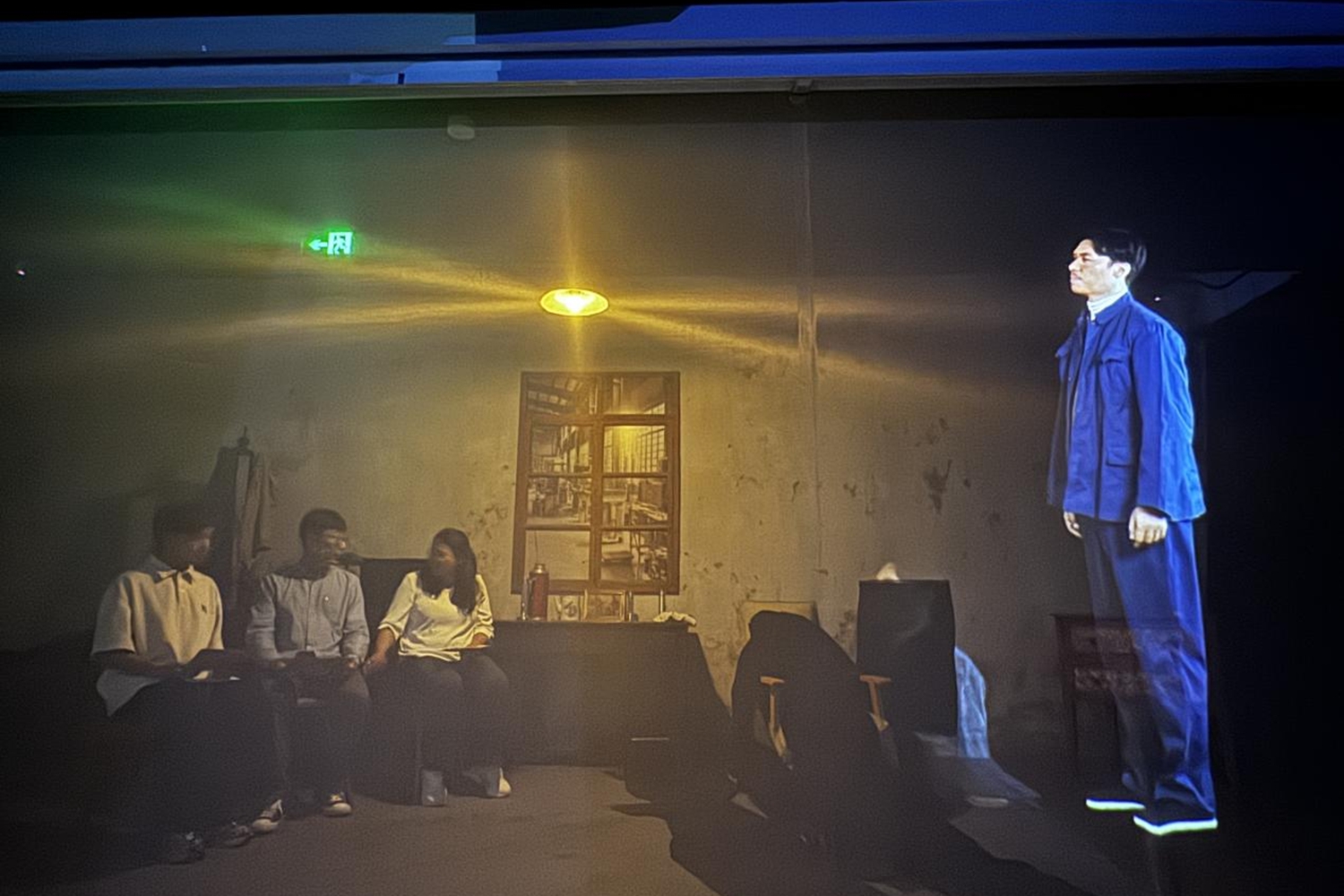 在“沉浸式”党课《足迹》体验环节中,在声光电多媒体互动系统支持下,教学内容以全景方式铺陈展开,师生们不仅能够视觉、听觉同步沉浸,还通过剧场式互动设置,亲身参与到剧情之中——成为焦裕禄同志的同事,在不同身份视角中切身体会他为治沙治涝、排盐种树、走村访户所经历的艰辛与信仰。当教学场景定格于焦裕禄手捧黄土、顶风踏雪深入沙丘调研的画面时,一句“吃别人嚼过的馍没味道”回荡在空间中,震撼直抵人心。