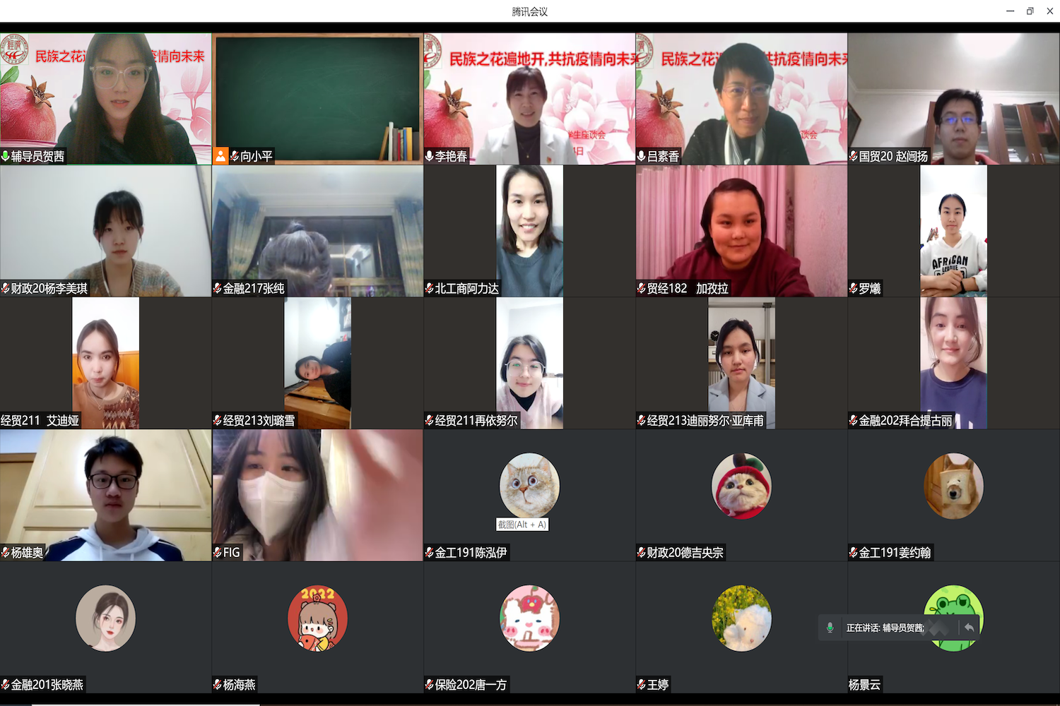 经贸211班 再依努尔.依米提、财政20班李美琪、经贸213班刘璐雪、金融217班罗爔作为少数民族学生代表发言,他们围绕学习、生活、心理等方面分享了自己的经验,同时也就疫情期间居家学习和防控措施等问题进行了交流。学生代表们纷纷表示在疫情居家学习期间,学院给予了许多关爱和支持,同时也对疫情期间的学校管理表示充分的理解和认可。他们表示,在居家学习时,一定要保持规律的作息时间,提高学习效率。作为新时代青年,在疫情防控的关键时刻,要有青春担当,主动遵守当地的疫情防控要求,用实际行动回报师长、回报学校、回报社会,希望不久的将来能在春暖花开的校园再次相遇。