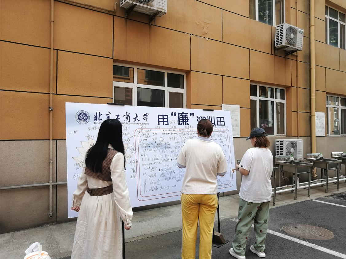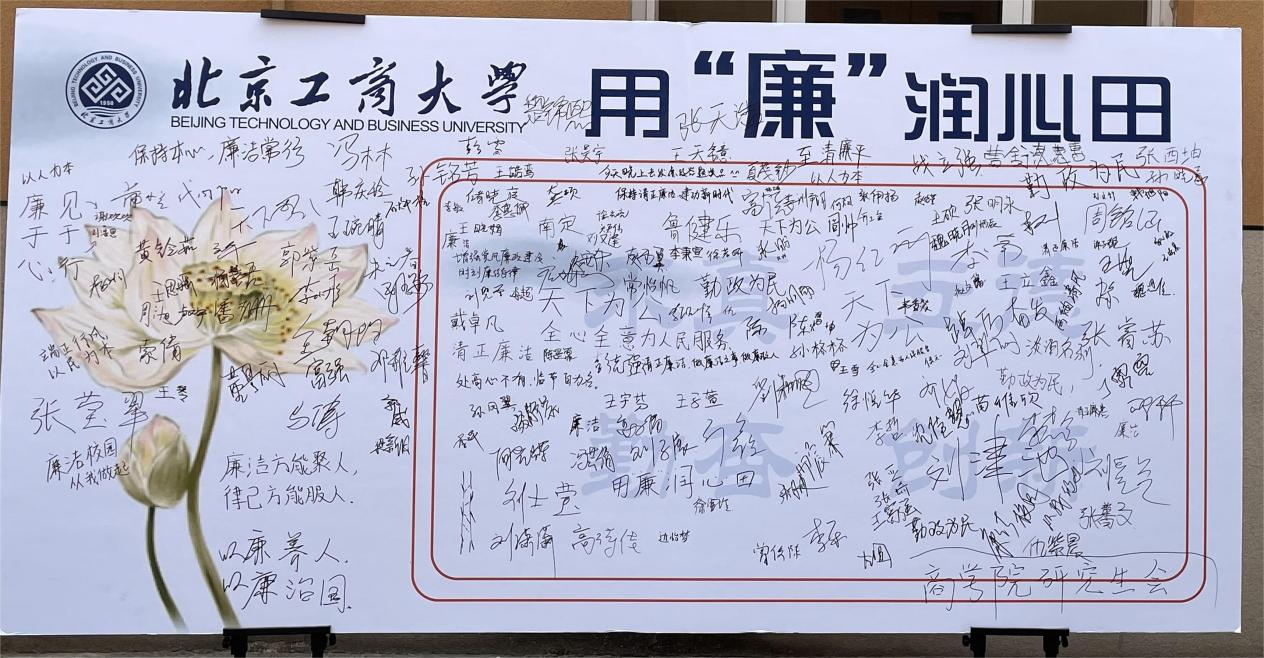 为营造良好的校园廉洁文化,商学院研究生会于5月14日11:00-13:00在阜成路西校区食堂门口举办“清风扶正气 廉洁伴我行”廉洁承诺签名活动。此次活动是商学院开展学生廉洁主题教育系列活动之一,共吸引了来自商学院、国际经管学院、轻工科学技术学院、生态环境学院等7个学院、180余名同学积极参与。