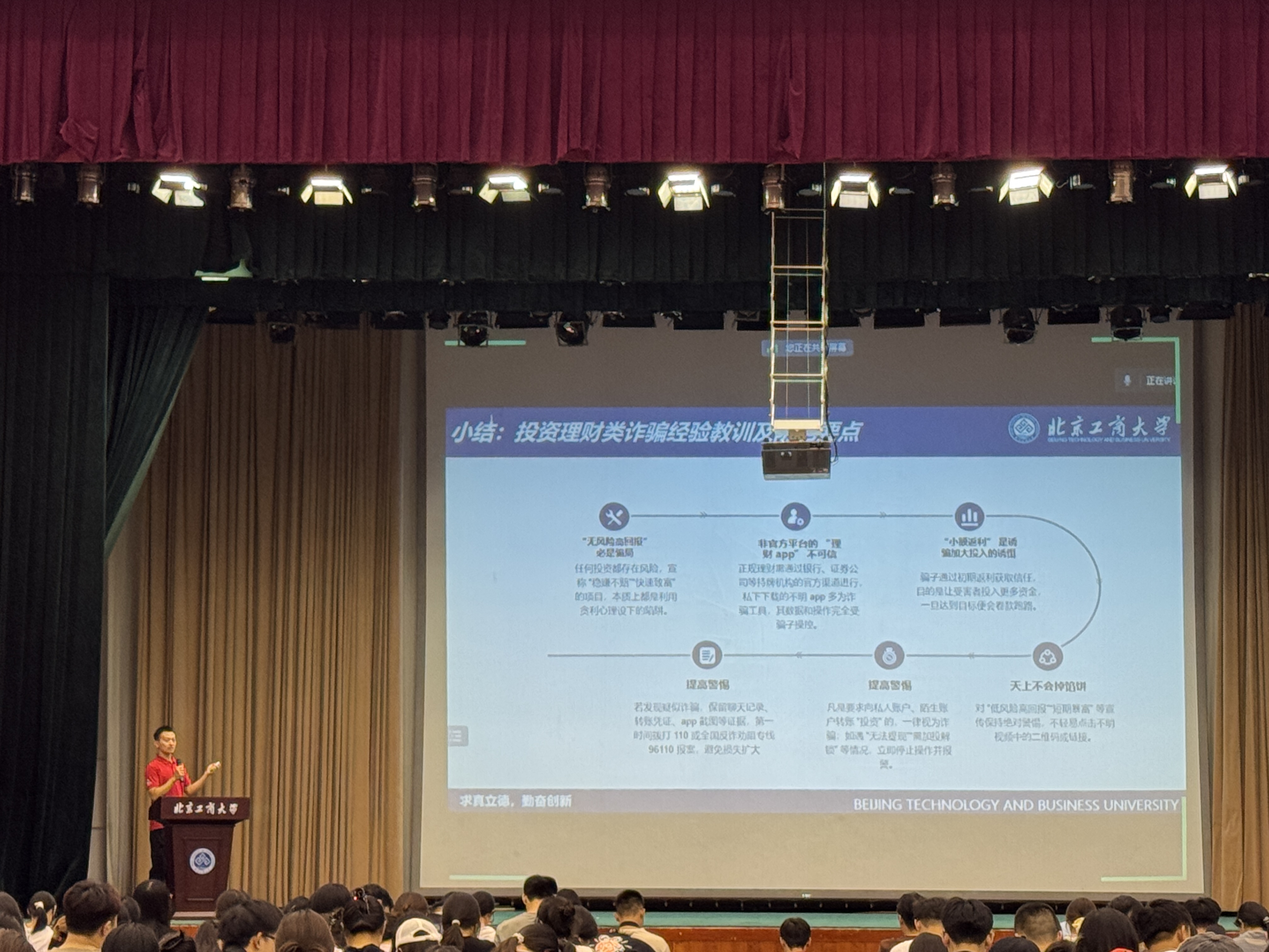 在本、研新生反诈安全教育讲座过程中,6名宣讲组成员分工合作,分别从电信网络诈骗概述、高校常见电信网络诈骗类型、我校防范电信诈骗工作开展情况、防范电信网络诈骗应对策略四个方面进行宣讲。在讲解高校常见电信网络诈骗类型环节,每个案例均通过视频和现场模拟表演短剧的形式来呈现,让听课学生在形象生动地短剧中“沉浸式”了解诈骗的详细过程,为日后可能遇到的诈骗场景留下深刻印象,减少上当受骗的几率。宣传大使还特别有针对性地介绍了我校近三年真实发生的电诈大数据,从电诈高发类别、高发时段、高发学院、高发群体、关键特征等方面进行分析,让新生既能直观感受到电诈风险就在身边,又清楚知道该从哪些方面进行重点防范。这种针对性强、寓教于乐的“朋辈教育”电诈教育宣传形式,较比传统的宣教模式在教育效果上有了很大的提升,是在高校反诈教育路径上的积极创新探索,得到了上级公安部门的高度肯定。