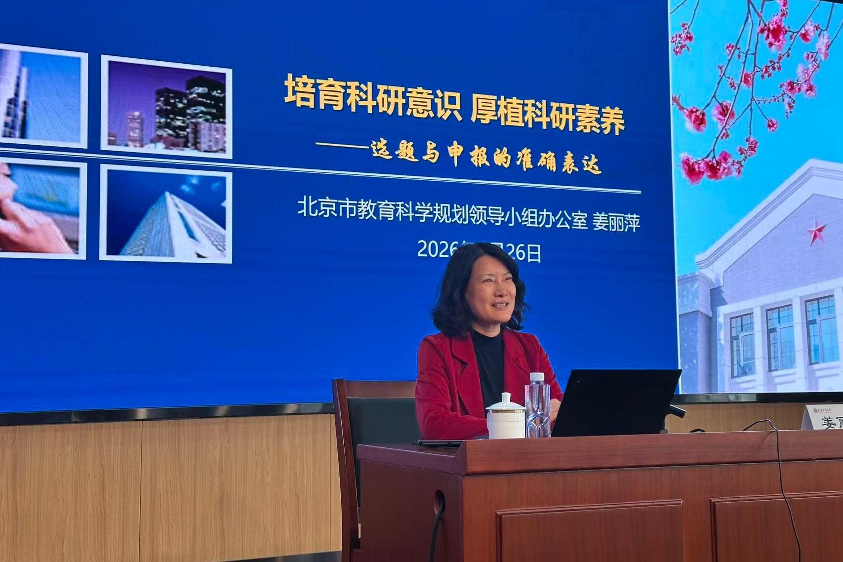随后,姜丽萍主任以“培育科研意识 厚植科研素养”为题,紧扣《北京市教育科学“十五五”规划2026年度课题指南》核心精神,从评审专家的视角,为参训教师开展了系统、专业的课题申报指导。讲座围绕教育课题申报的选题方法、申报书撰写规范两大核心内容,系统梳理了选题中的常见误区、研究问题的来源与表述规则,结合大量典型案例,细致讲解了申报书各模块的写作要求、逻辑架构与填写技巧。同时,姜丽萍主任结合学校办学特色与学科优势,针对选题策略、研究内容凝练、研究方法设计等关键环节,精准解析了逻辑结构搭建、常见问题规避等实用方法,为教师们开展课题申报工作厘清了思路、提供了可操作的实践路径。