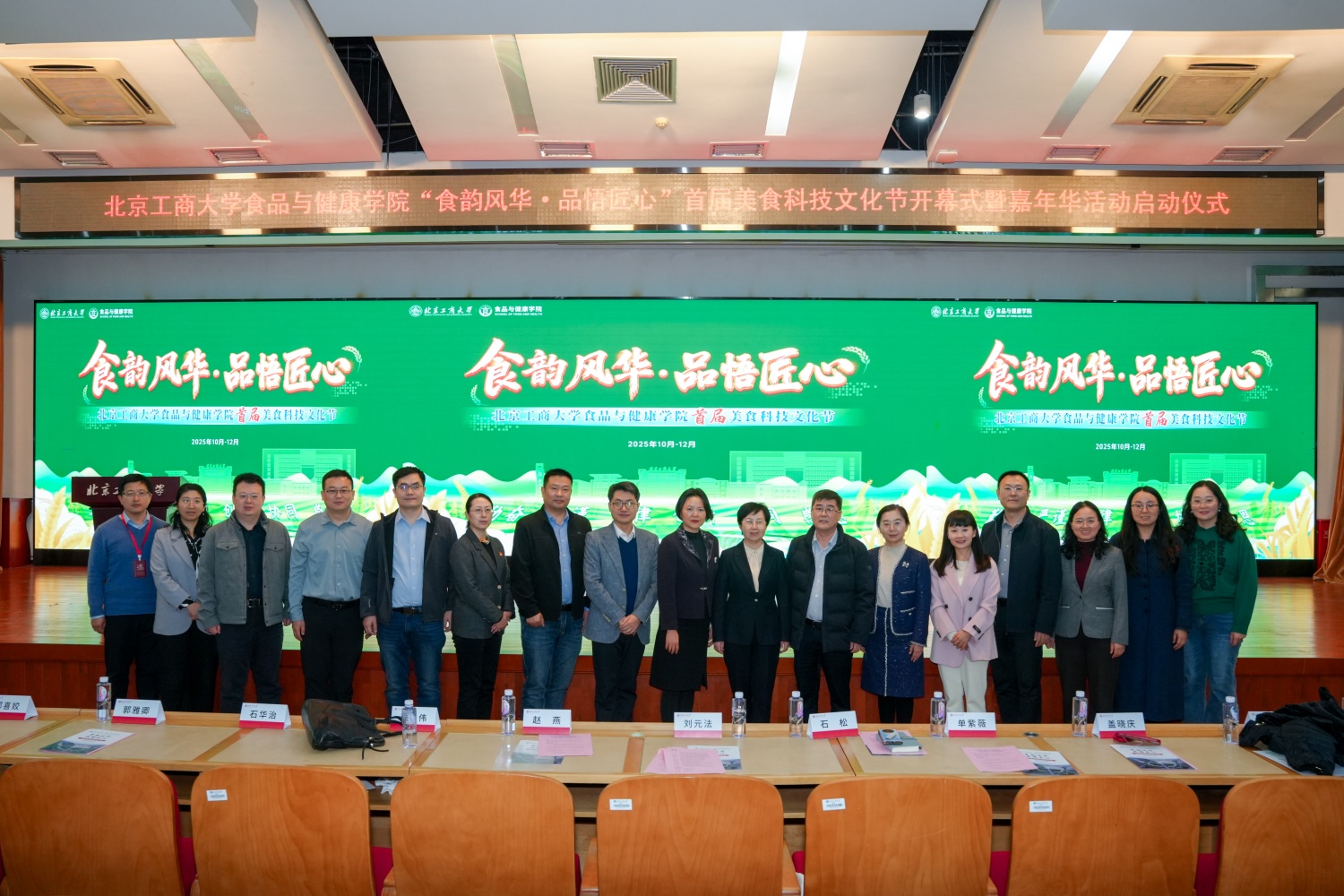 11月5日,食品与健康学院“食韵风华・品悟匠心” 首届美食科技文化节开幕式暨嘉年华活动启动仪式在良乡主校区学术报告厅举行。来自北京食品科学研究院、中国食品药品企业质量安全促进会、北京同仁堂健康药业股份有限公司、同仁堂药酒厂、北京北冰洋食品有限公司、北京神州味业科技有限公司等特邀行业和校友嘉宾,学校发展规划处处长刘元法、招生就业处处长石松、团委书记单紫薇、教务处副处长盖晓庆、学院全体领导、各系党支部书记、系主任、教师代表、辅导员及在校本研学生300余人齐聚一堂,共同见证活动启幕,仪式由学院党委副书记熊慧主持。