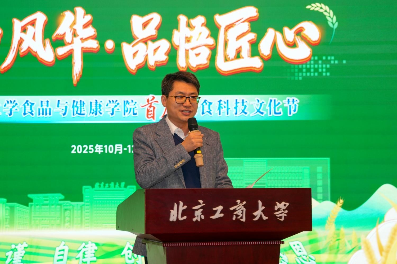 食品与健康学院院长王彦波致辞,向莅临活动现场的各界嘉宾表示热烈欢迎和衷心感谢。他谈到,学院始终坚持服务国家战略、服务新时代首都发展的使命,以“工商一体化”理念为引领,推动学科交叉融合,在“AI+食品健康”“智能检测技术”“功能性食品研发”等前沿方向持续突破。他鼓励同学们以美食科技文化节为“科创练兵场”,主动走进美食嘉年华和企业嘉年华,在互动中深化专业认知;主动参与学术交流,在研讨中拓宽思维视野;主动参加各类学科竞赛,在竞技中锤炼实践能力。