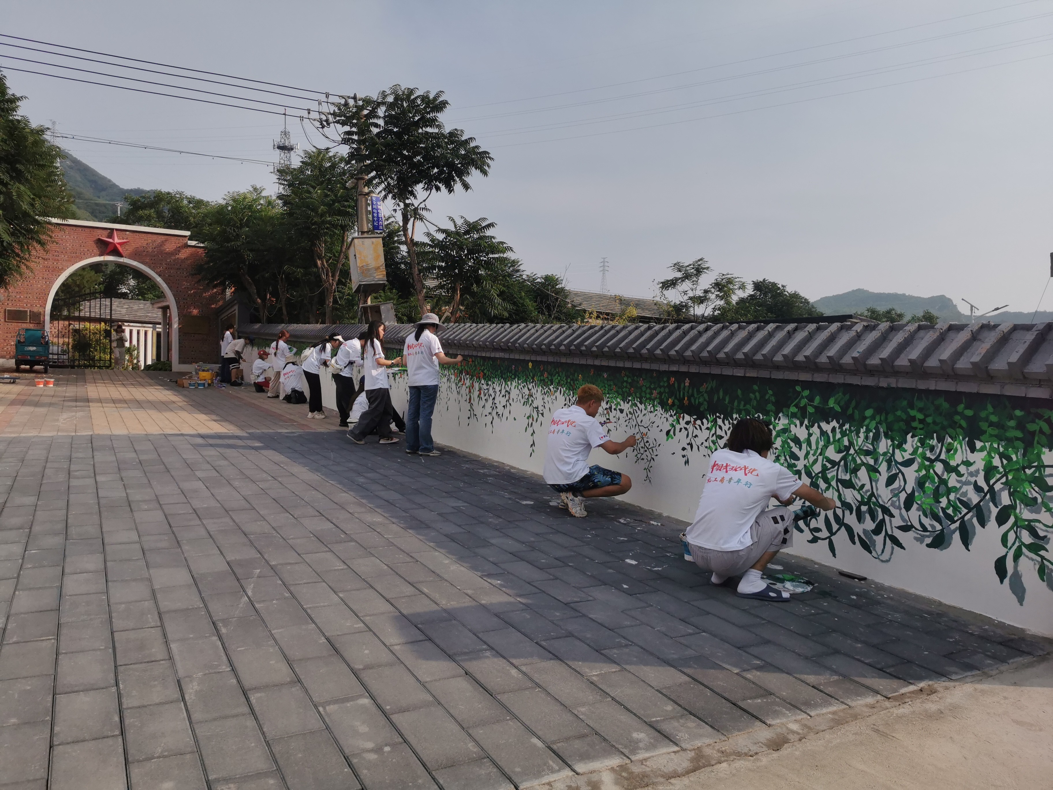 实践团在田庄村开展墙体彩绘,助力乡村环境美化,用专业所学扮靓乡村。烈日炎炎下,同学们专注勾画,精美画作跃然墙上,停笔眺望,青山绿水映入眼帘。通过同学们的巧手绘画,绿色的藤蔓、彩色的鲜花便爬满了半面墙,与周围的青山绿水遥相呼应。虽然同学们画风各异,一种植物十五个样,但这正体现了植物的野蛮生长,组合起来颇有自然趣味。同学们脸上是汗水,身上是颜料,眼里却是用实际行动助力乡村振兴的坚定,一旁白墙上“为人民服务”的红色大字在太阳的照耀下闪烁着金色的光芒,与同学们挥汗如雨的身影相互映衬。实践团成员用实际行动践行“全心全意为人民服务”的根本宗旨,赢得了当地村民的赞赏。在今后的日子里,实践团成员也将继续发扬艰苦奋斗的优良作风,勇立时代潮头,争做时代先锋,把人生理想融入为实现中华民族伟大复兴的奋斗中,不断贡献青春力量。