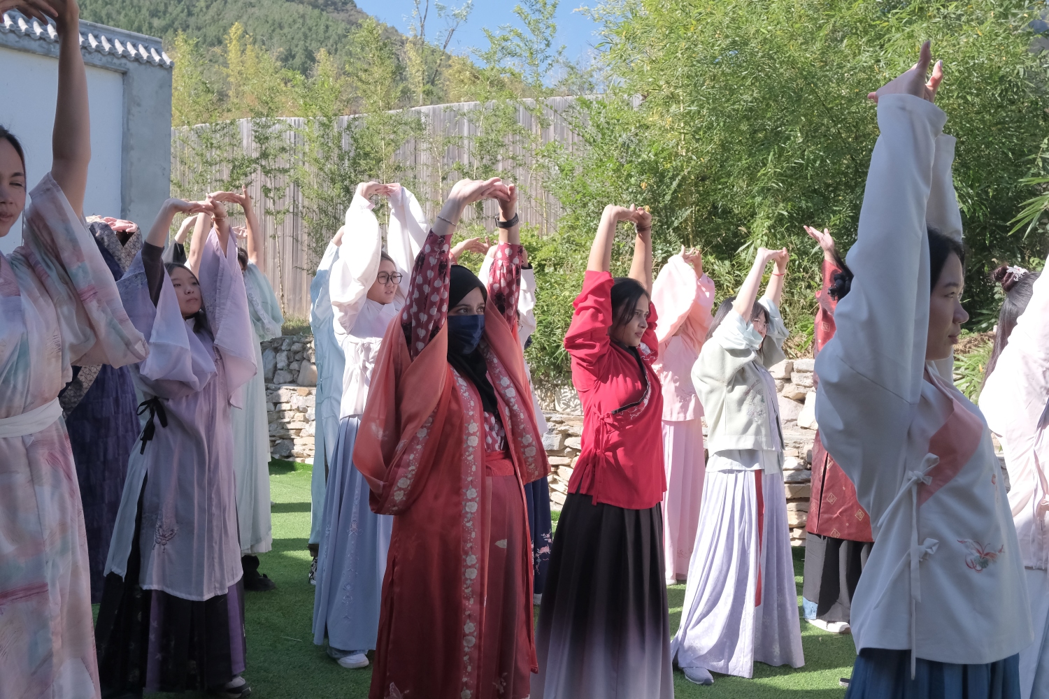 房山区修德谷是弘扬中国文化的开放式教育基地,是团中央挂牌的“在华留学生的第二课堂”。当天恰逢中国的传统节日重阳节,活动伊始,中外学生换上中国古代传统服装,在山谷中登高远望,沉浸式体验汉服文化,以一场穿越时光、跨越空间的意境,在中国传统节日庆祝礼仪和民俗体验中感受中华传统文化底蕴。