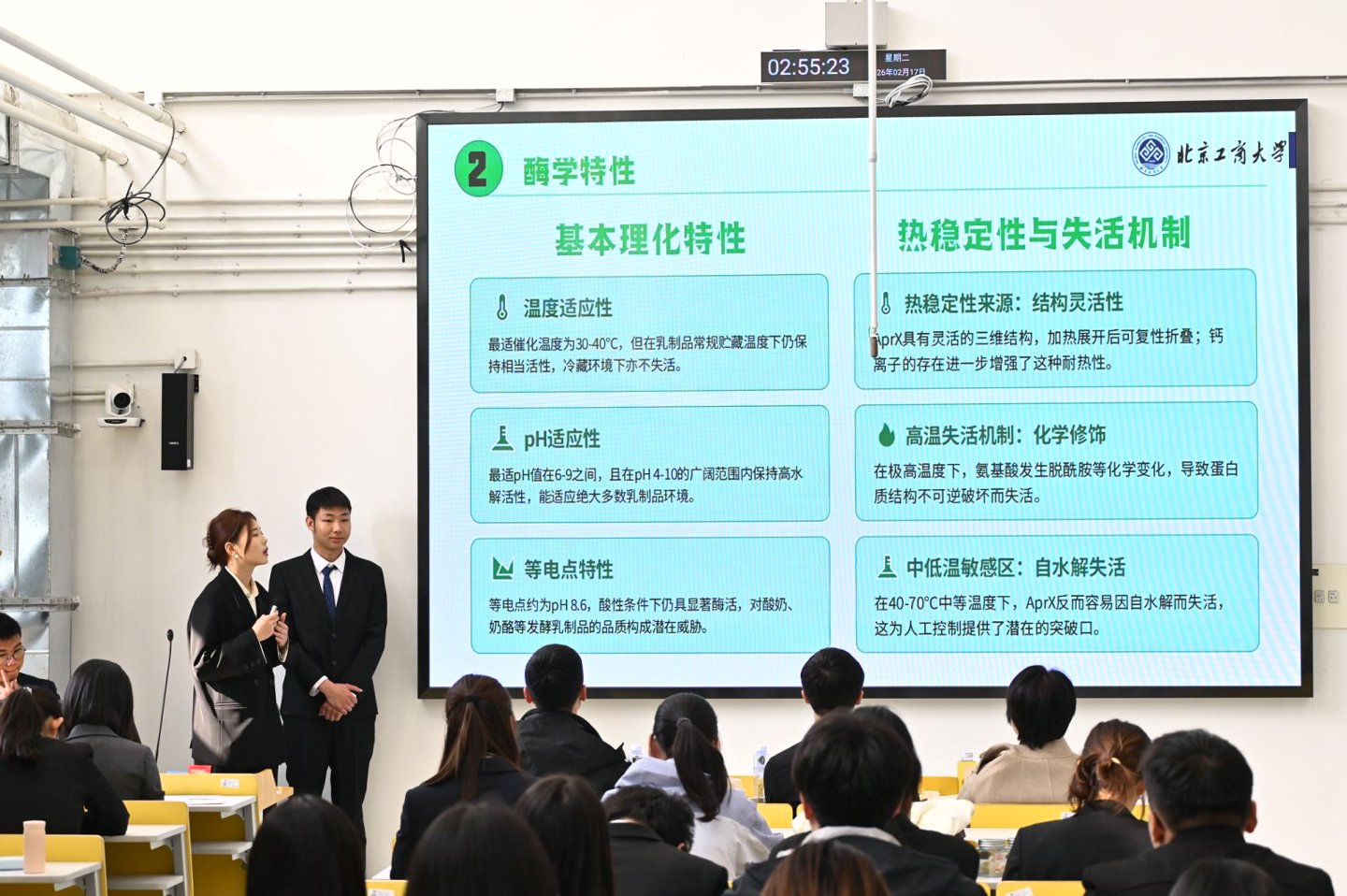 答辩环节在食品大楼举行,项目覆盖营养健康、风味开发、品质检测、产业技术改良等诸多领域,紧密贴合食品大健康产业需求。多个项目将药食同源理念融入运动营养、功能性食品开发;借助AI技术开展食品配方设计、风味精准调控与营养优化;依托生物医药技术研发活性肽、功能性蛋白,针对性解决老年肌少症、特殊人群营养补给等行业痛点;低卡零糖、靶向风味、健康烘焙等成果,精准对接健康消费新趋势,实现技术创新与产业需求深度融合。评审专家们从技术可行性、商业逻辑、社会价值等方面精准点评,针对技术壁垒、产业化路径等关键问题深入提问,在肯定成果的同时提出优化建议,助力项目从创意构想向可落地成果升级,为后续竞赛申报与成果转化夯实基础。