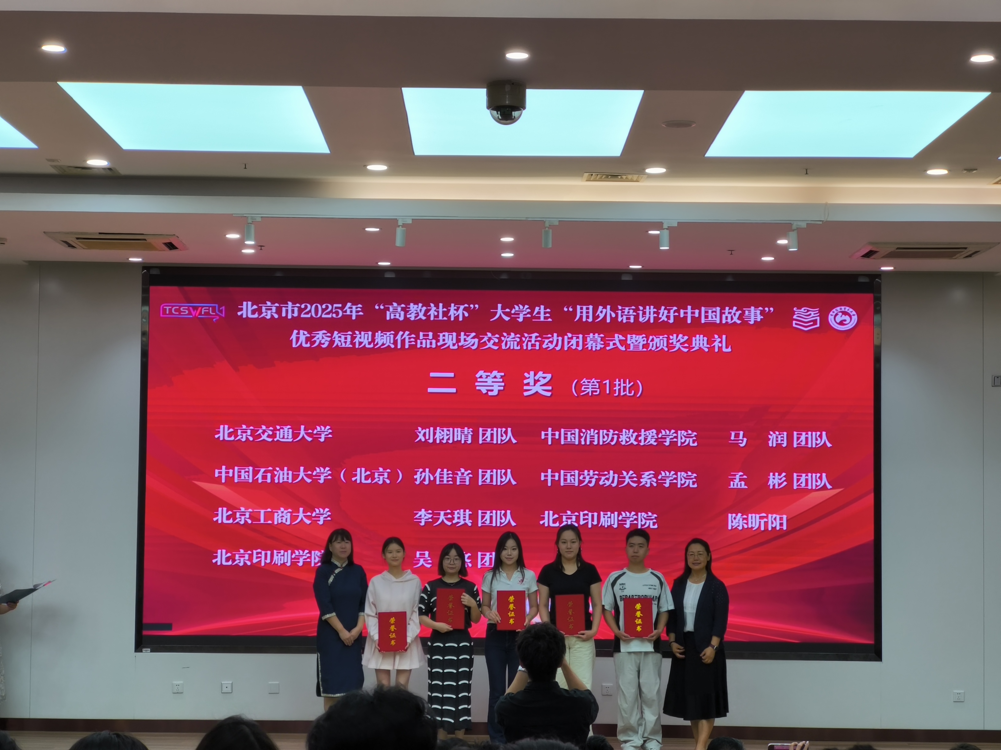 2025年9月13日上午,北京市2025年“高教社杯”大学生“用外语讲好中国故事”优秀短视频作品征集活动颁奖典礼在首都经济贸易大学博学楼报告厅隆重举行。本次活动由北京市教育委员会高等教育处与高等教育出版社联合主办,首都经济贸易大学承办,北京市高教学会大学外语研究分会、北京市高校外语课程思政联盟协办。来自首都35所高校的师生代表齐聚一堂,共赴一场青春与创意、外语与文化的盛会。