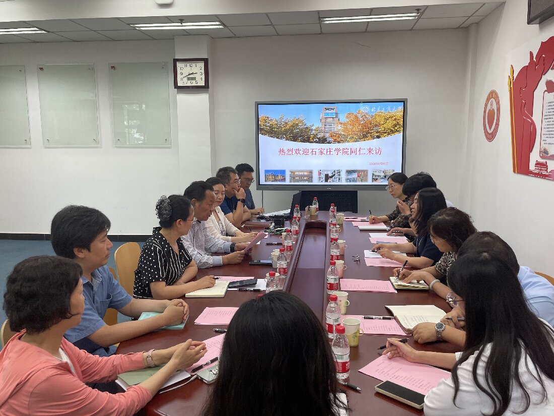 郑文红代表学校对石家庄学院同仁的来访表示热烈欢迎,他介绍了学校历史沿革、办学特色、人才培养及发展规划等情况,对近年来学校在人才培养、学科建设、师资队伍、科学研究等方面所取得的成绩做了详细说明。他表示,两校同为地方高校,立足地方、服务地方、争创一流,在很多领域可以开展合作;特别是在京津冀一体化十周年之际,希望两校进一步加强交流,在红色资源共享、优秀生源输送、图书馆合作共建、创新创业教育等方面,加强协同、共促发展。