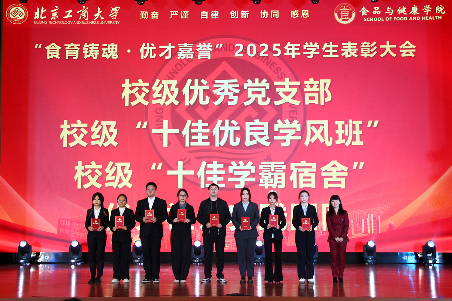 12月6日,食品与健康学院在良乡校区隆重举行“食耀青春 筑梦新程”2025年学生表彰大会暨首届美食科技文化节闭幕式。学校党委常委、副校长寇红江,学校团委书记单紫薇,学院特邀嘉宾味食源奖学金管理方代表、北京味食源食品科技有限公司董事长助理兼研发总监严江,钟香驹奖学基金管理人、钟香驹教授之女钟捷,中融百鸣投资管理集团有限公司董事长陶庆,北京康安利丰农业有限公司党支部书记、副总经理乔雪静,北京藻辰生物科技有限公司创始人杨阳,北京首朗生物科技有限公司常务副总经理李重阳,北京康比特体育科技股份有限公司产品开发中心总监王冬,食品与健康学院领导班子、各系主任以及教师代表、班主任代表、辅导员、学生代表齐聚一堂,共同见证学院人才培养成果,表彰先进典型。