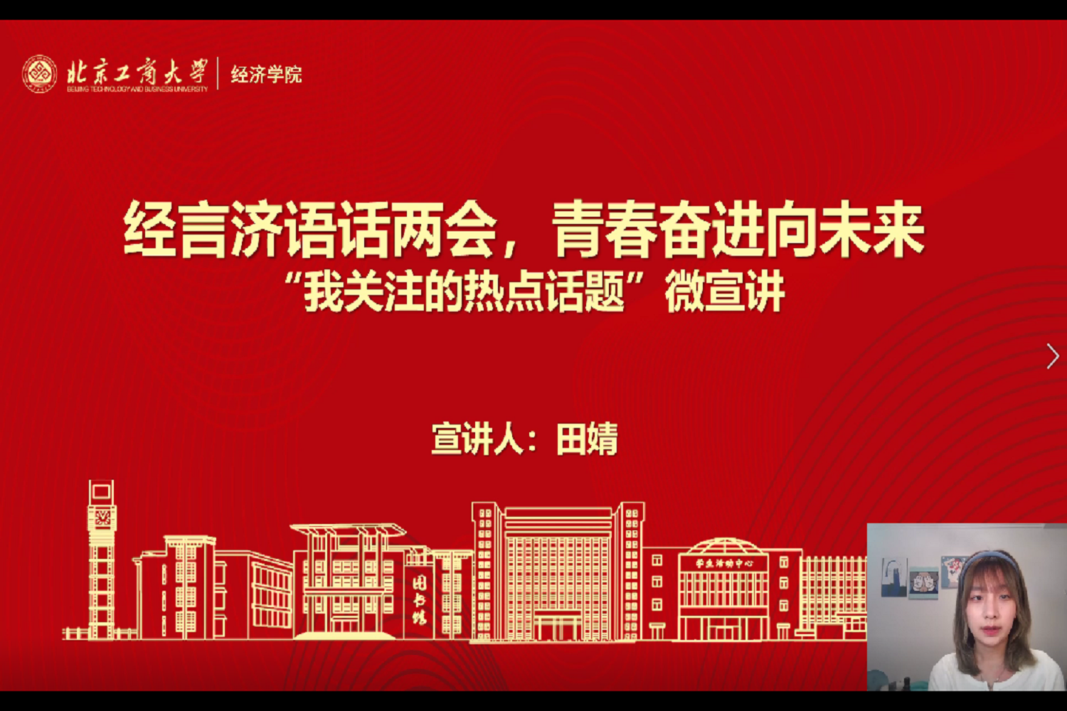 商学院李佳璇从“我身边的两会故事”谈起,深入解读了今年政府报告传递给人民的新信号,她为祖国过去一年的丰硕成就感到自豪,对今年的奋斗目标倍增信心;电商与物流学院的张乐表示,他很关注政府工作报告以及各地代表们的提案,他认为数字技术引领的第四次工业革命即将到来,两会的提案让他对未来职业无限憧憬;生态环境学院的陈致远则从人民为本的理念出发,他认为政府工作报告充分体现了持续增进民生福祉、推进共同富裕的民生政策基调,真正体现了中国共产党人民为本的执政理念;数学与统计学院的张文佳则从教育改革的角度出发,面对“双减政策”,结合自身实际,对国家未来的教育改革的发展方向提出了自身的见解。