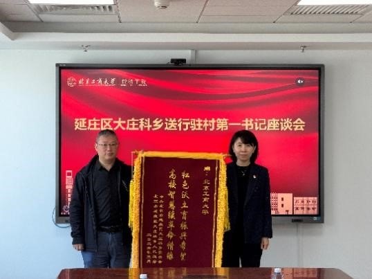 大庄科乡纪委书记程飞、霹破石村党支部书记杨忠云分别向学校赠送锦旗,表达对北京工商大学、对向小平同志两年多来倾力帮扶、助力乡村振兴的诚挚谢意,学校组织部副处级组织员张巍、经济学院党委书记张春萍接受锦旗。锦旗上镌刻的字样不仅承载着乡、村两级对帮扶工作的高度认可,更凝聚着校地同心携手、共促乡村振兴的深厚情谊。