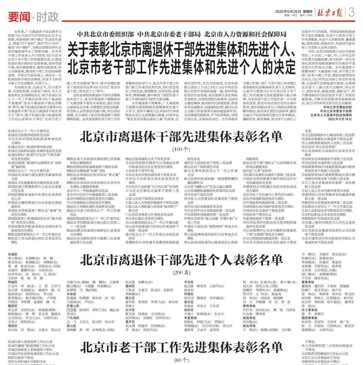 6月25日上午,北京市离退休干部庆祝中国共产党成立104周年“双先”表彰暨“六好”示范党支部宣讲报告会在北京会议中心隆重举行。会议宣读了中共北京市委组织部、中共北京市委老干部局、北京市人力资源和社会保障局《关于表彰北京市离退休干部先进集体和先进个人、北京市老干部工作先进集体和先进个人的决定》,表彰100个“北京市离退休干部先进集体”、200名“北京市离退休干部先进个人”、60个“北京市老干部工作先进集体”和100名“北京市老干部工作先进个人”。
