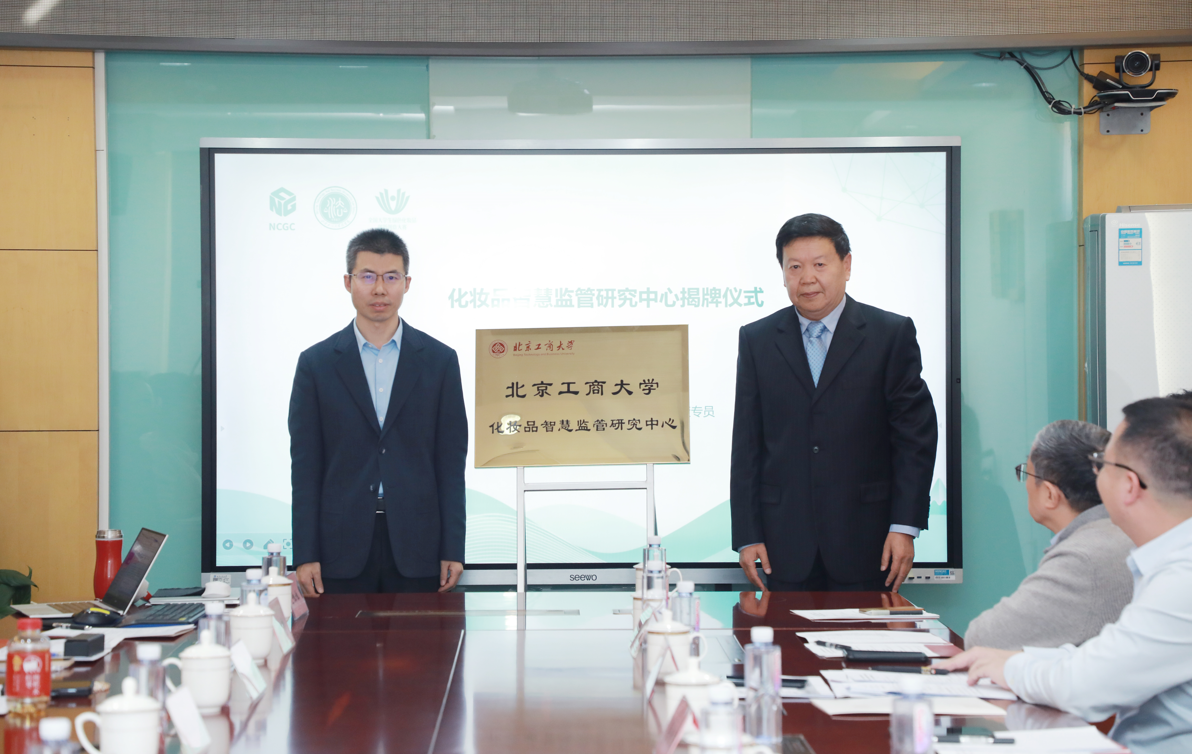 毛新述和李玉家共同为化妆品智慧监管研究中心揭牌。