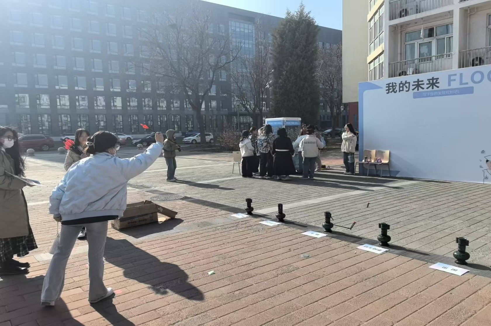 “你的就业去向”射箭投壶环节吸引了众多目光。投壶上标记着六种主要的就业去向:就业协议、劳动合同、考研、出国、自主创业、基层就业,仿佛在向同学们发出邀请,让他们思考并选择自己的去向。同学们手握箭矢,全神贯注地瞄准目标,每一次投箭都承载着他们对未来的期待与决心。当箭矢稳稳落入壶中,现场爆发出阵阵欢呼声,命中者也更加坚定了自己未来就业去向的选择。