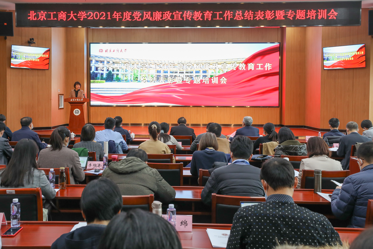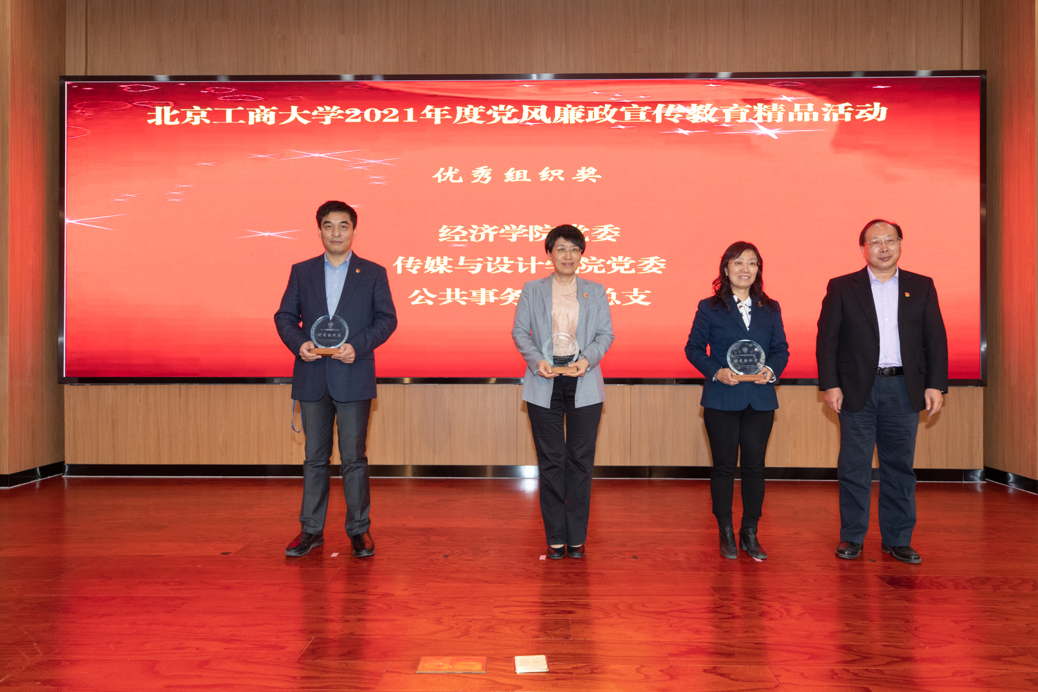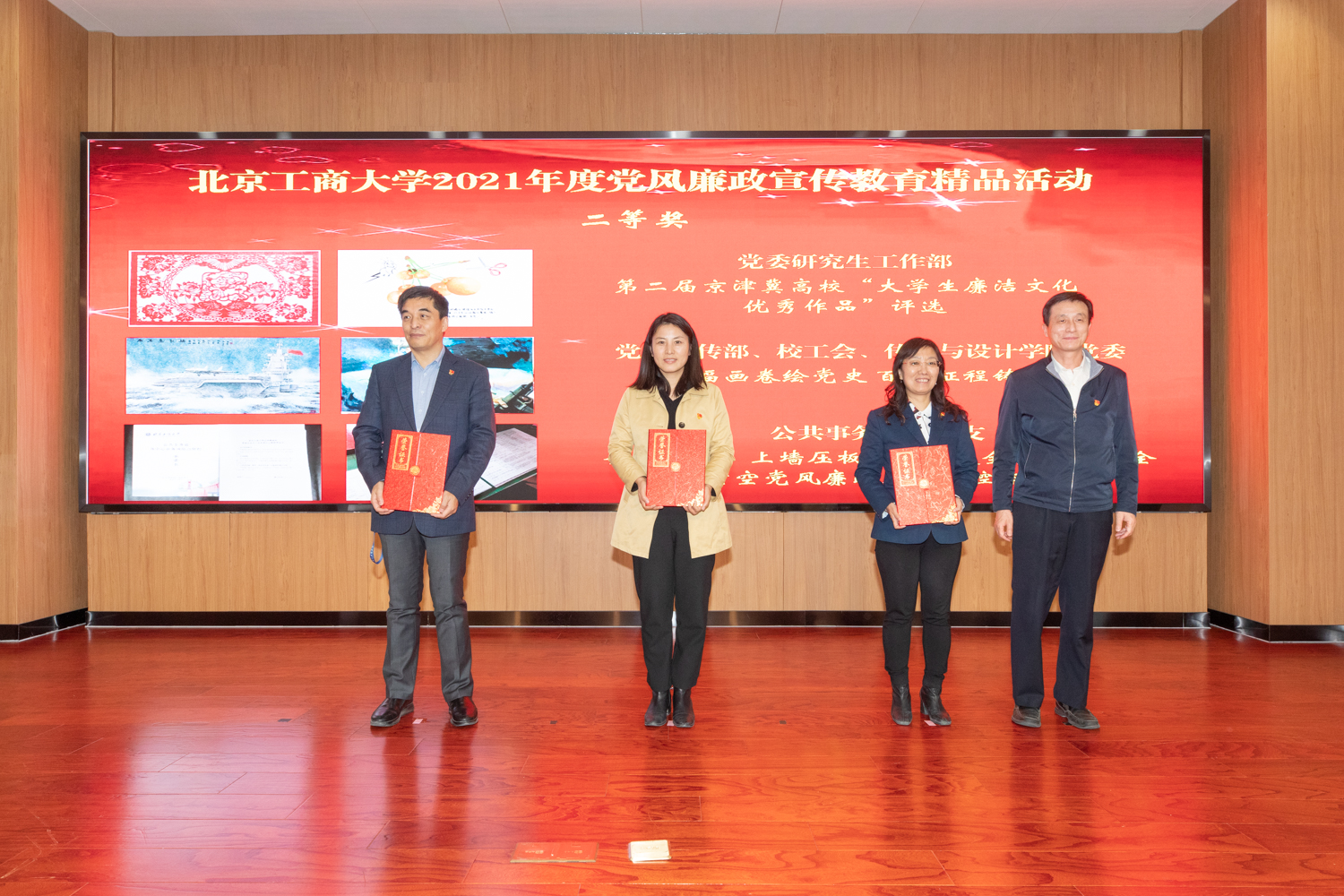 李中奇宣读了北京工商大学2021年度党风廉政宣传教育精品活动获奖名单。“品·廉述工商——我身边的廉洁故事短剧大赛”“‘颂党风 传家风 强作风 促学风’大学生廉洁教育汇报演出”等17项活动分获一、二、三等奖和优秀奖。经济学院党委、传媒与设计学院党委和公共事务处党总支获得党风廉政宣传教育工作优秀组织奖。校领导为获奖单位颁发奖杯和荣誉证书。