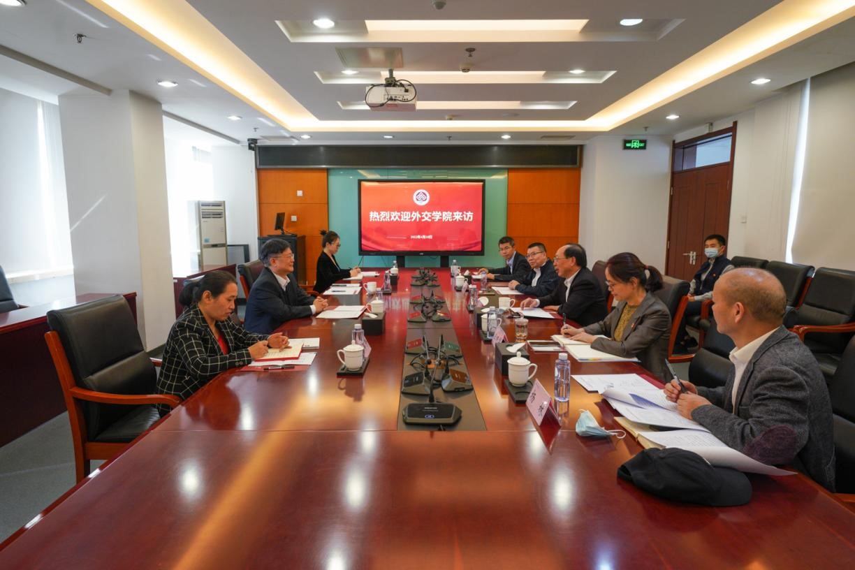 4月18日下午,外交学院党委书记崔启明,副院长王帆一行来校就“访企拓岗”专项行动进行座谈交流。党委书记黄先开、副校长龚六堂出席会议。会议由龚六堂主持。