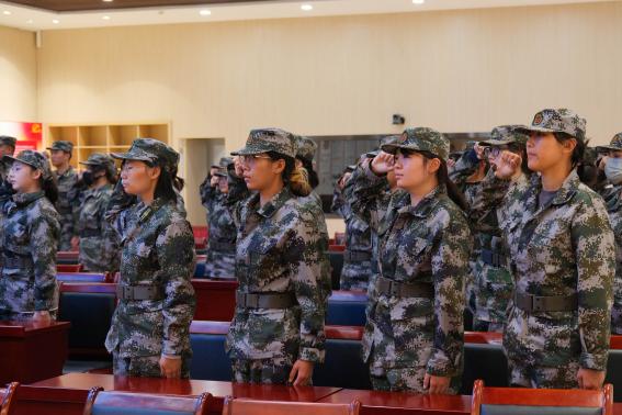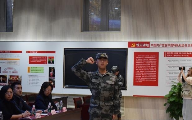 在集训动员环节,郑光宣读了《关于组织开展北京工商大学2024年度民兵集训的决定》。民兵副连长郝乐之带领民兵连全体新队员面向连旗,进行了庄严的入队宣誓仪式。