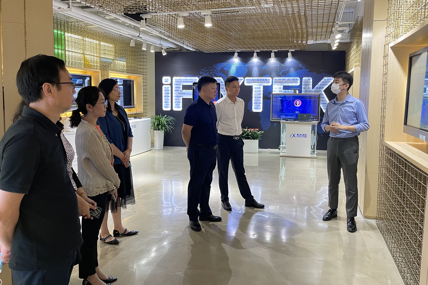 学校调研团参观了科大讯飞展厅,体验了科大讯飞核心技术及行业应用,听取了讯飞A.I.助力高校智慧教学发展的应用成果汇报和人才需求情况。