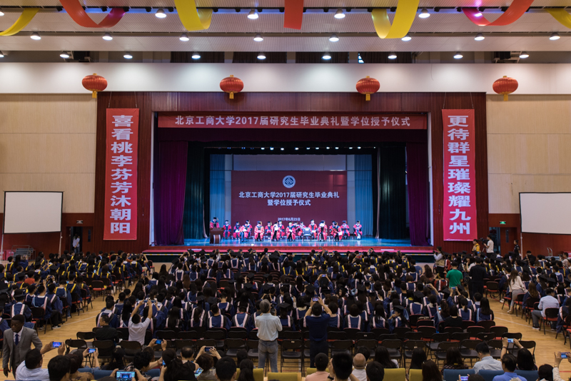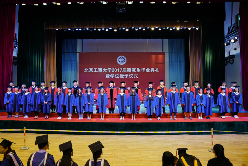 副校长谢志华宣读了《北京工商大学关于2017届研究生准予毕业及学位授予的决定》,副校长李朝鲜宣读了《北京工商大学关于表彰2017届优秀毕业研究生的决定》。2017年,我校共有1名博士和878名全日制硕士研究生获得毕业证书,共有1名博士研究生被授予博士学位,914名硕士研究生(含非全日制和同等学力)被授予硕士学位;有83名研究生被评为校级优秀毕业生,其中32名研究生被推荐为市级优秀毕业生。