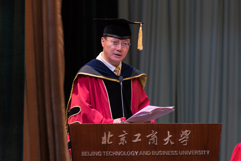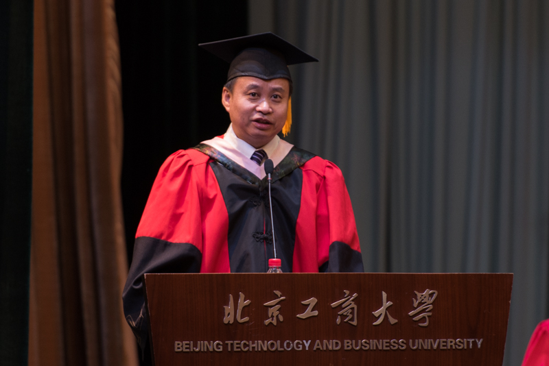 校长孙宝国院士在发言中,代表学校党委和行政向圆满完成学业的博士、硕士毕业生表示热烈祝贺,向付出辛勤劳动的全体教职员工表示衷心感谢,向参加毕业典礼的家长致以诚挚欢迎。孙校长肯定了2017届毕业研究生在学期间致力于科学研究和技术创新,用辛勤付出换来的丰硕成绩。他谈到,作为学校首届唯一的博士毕业研究生戴怡凤是一位优秀的博士生,在校期间以第一作者发表SCI收录论文3篇,2篇A1、1篇A2论文,其中一篇论文发表在国际食品科技领域顶尖学术期刊“Journal of Agricultural and Food Chemistry”上。这充分说明,学校完全有能力培养高水平的博士毕业生,今后将培养更多优秀的博士研究生。作为毕业人数及留学生历年来最多的一届,2017届研究生共取得科研成果905项,其中SCI收录论文53篇;EI收录论文74篇,比上一届增长51%;CSSCI收录论文40篇,比上一届增长1倍;授权发明专利18件,是上一届的3倍多;24人考取博士研究生。孙校长建议即将离开北工商校园的同学们铭记“求真立德修心性,勤奋创新建奇功”做事先做人的道理,并以“自觉、担当、感恩”寄语奔赴人生新征途的学子们,希望大家在今后的学习工作中,坚持自觉,积极进取;敢于负责,善于负责;常怀感恩之心,激情工作,快乐生活,成就事业。他最后祝愿同学们承载着家庭的梦想、母校的期望去扬帆远航,牢记校训,努力拼搏,成就辉煌!