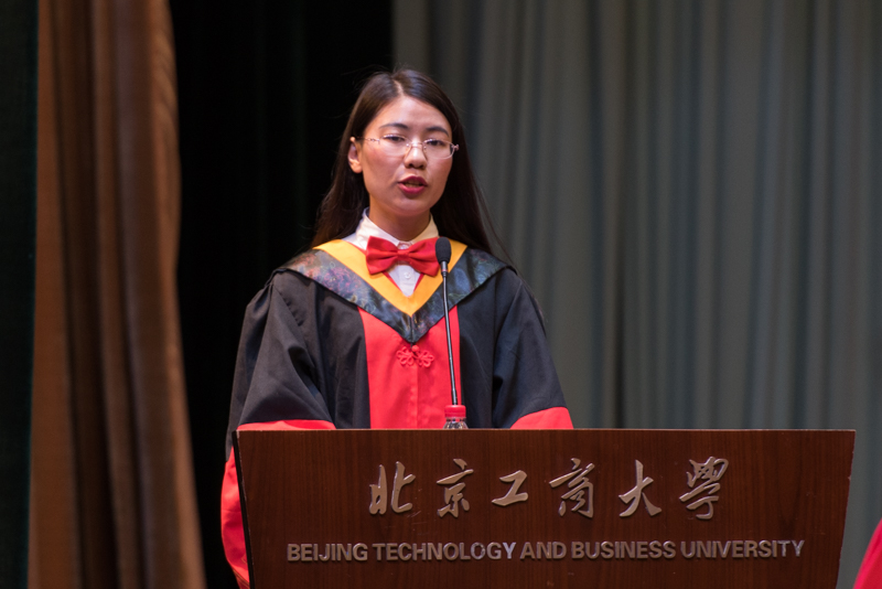 我校首位博士毕业生食品学院研究生戴怡凤代表2017届研究生毕业生发言。她表达了对母校的悉心培养、老师辛勤教导的衷心感谢和恳切敬意,回顾了与老师和同学学习、生活的点点滴滴,认为北工商的学习经历对自己的人生影响深远,并分享了自己的收获和心得,她表示将无愧于母校的培养,希望母校因所有毕业生的成功而更加闪耀。