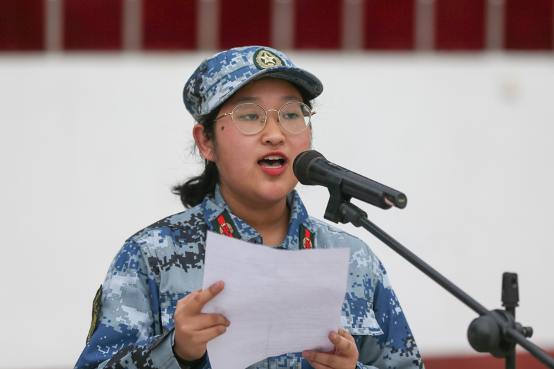 来自商学院会计学专业的彭书雅同学代表全体参训学员发言。她首先表达了对教官和老师们的感谢,分享了她对军训重要意义的理解。彭书雅认为,军训不仅是最好的一次国防教育,更是一个大课堂,能够锻炼意志,让同学们学会坚韧、宽容、自立和吃苦耐劳,也更懂得自制、自爱、自信和自强。她代表所有参训学员作出承诺:服从命令,听从指挥,严格落实军训团各项规定、要求,坚决服从教官、老师的管理;不怕吃苦,严格训练,高标准地完成所有既定的军训科目;热爱集体,珍惜荣誉,形成比学赶帮超的良性竞争氛围;虚心学习,重在传承,将部队的好传统、好作风在今后的学习生活中延续。