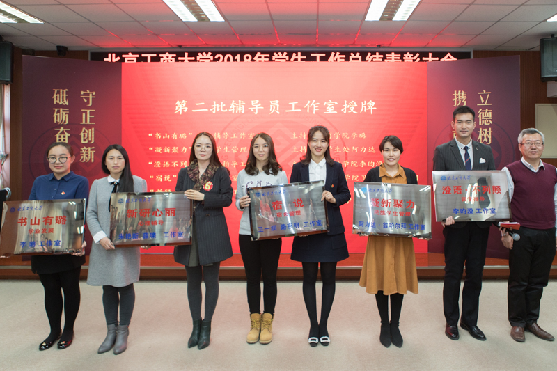 大会播放了2018年学生工作总结视频。对本年度新评选的辅导员工作室进行了授牌。在总结前期成功经验的基础上,今年我校评选出了第二批共5家辅导员工作室,工作室内容涵盖了学业辅导、心理健康教育、宿舍管理、少数民族学生教育、留学事务指导。学生工作部通过工作室平台建设,有效推动了辅导员专家化发展,规划了辅导员职业发展路径,为我校思政工作提供了有力的支持。