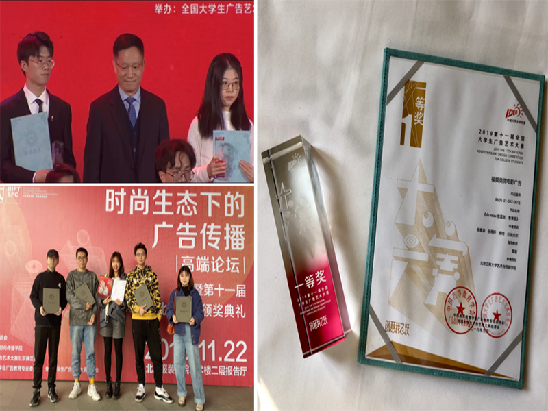11月23日,由中国高等教育学会、教育部高等学校新闻传播学类专业教学指导委员会主办的第11届(2019)全国大学生广告艺术大赛(以下简称大广赛)颁奖典礼在京举行。我校艺术与传媒学院广告专业学生作品荣获全国一等奖、三等奖。视传专业与数媒专业学生取得了全国二等奖、三等奖。