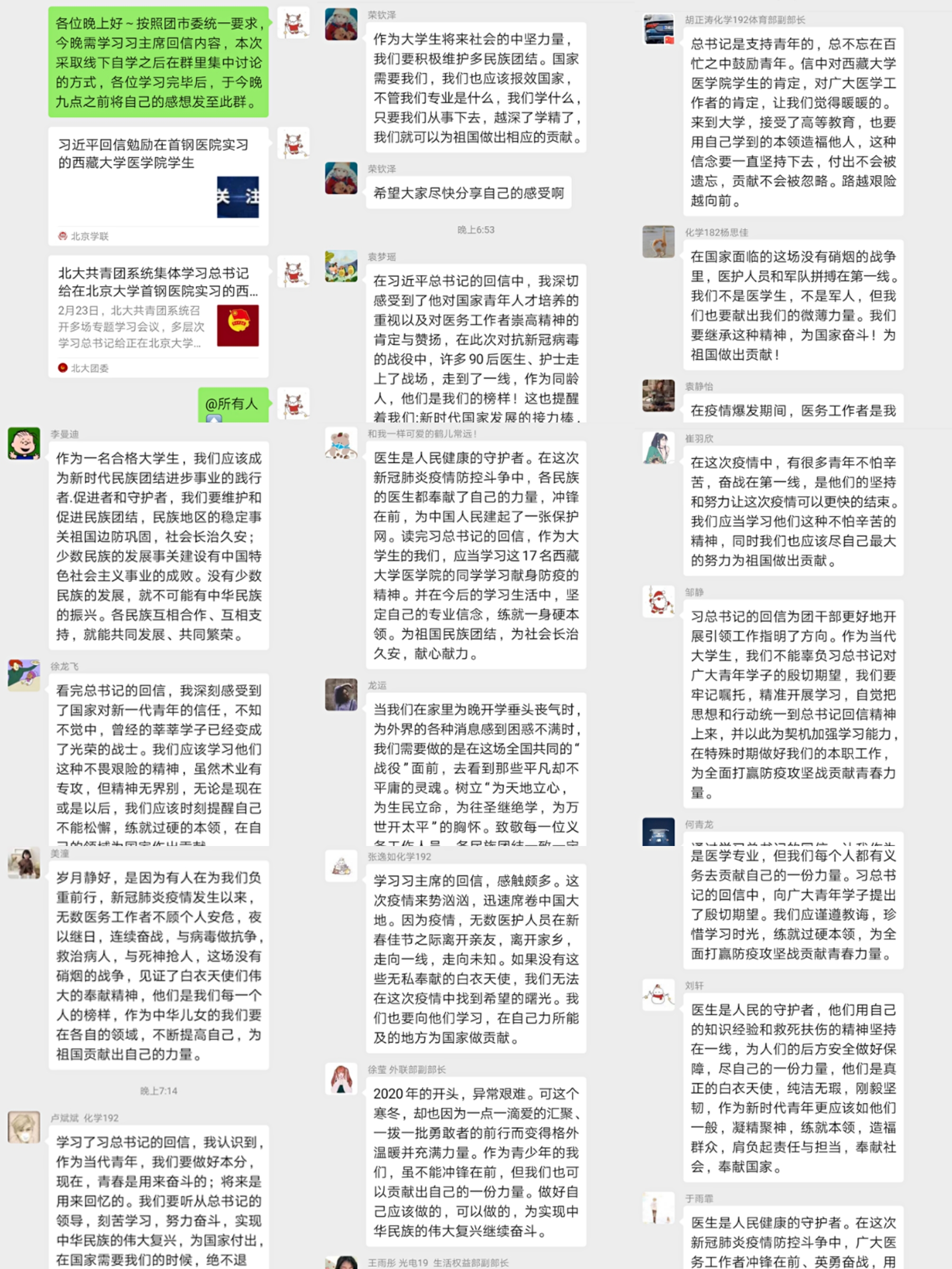 通过线上会议讨论交流及线下学习的形式,学院团委组织各团支部认真学习研读了习总书记的回信。同学们通过分组讨论、自学等方式学习了习总书记给西藏大学医学院在北京大学首钢医院实习学生的回信后,备受鼓舞,深感责任重大,在班群内写下了感悟,分享了学习心得,进一步地感受到了肩上的责任与使命担当。