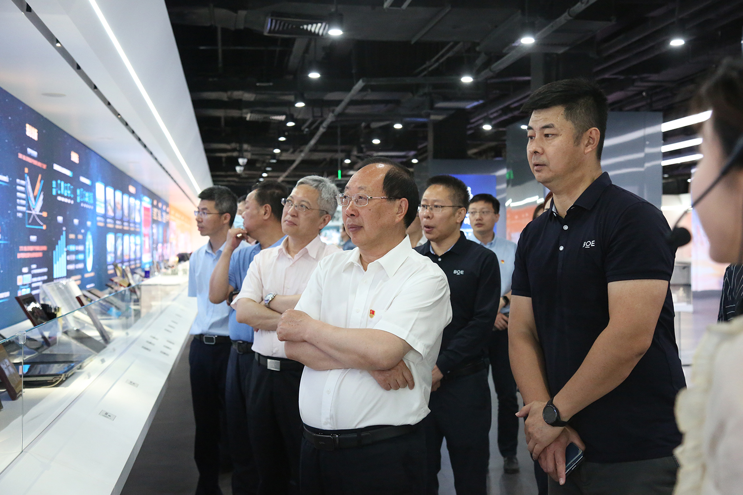 调研团实地参观了京东方历史展览馆,详细了解了京东方“转型创业、发展主营”“突破‘屏’颈、迈向领先” “实现领先、智见未来”三个历史发展阶段,了解了京东方在创业创新实践中形成的优秀企业文化和方法论体系。通过现场解说、实景呈现和视频播放等多种形式,参观人员体验了京东方半智慧黑板、智能交互画屏等创新产品,全面了解了京东方在传感器、显示器及智慧系统创新应用方面的最新成果,深入了解了企业在智慧园区、智慧校园等产品领域的布局及经典案例。