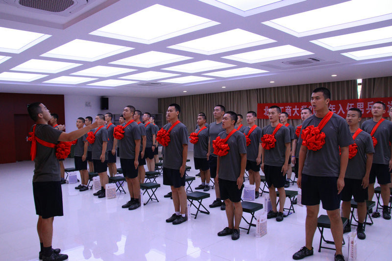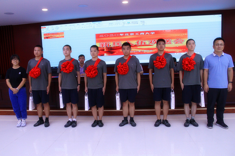 吕良宣读了我校2020年入伍男兵光荣榜。学校“战友协会”、“国旗护卫队”、民兵连的退伍老兵骨干通过视频的形式为今年入伍新兵送上祝福和希望。今年刚刚退伍的人工智能学院王妍紫作为退伍老兵代表讲述了自己入伍两年如何从迷茫、找不到努力方向到在部队锻炼发展成为一名果敢坚毅、坚持不懈、蜕变重生老兵的心路历程。传媒与设计学院产设162班张晓刚代表入伍新兵发言。他表示,从小就有一个从军梦,在大学期间耳濡目染学校太多优秀的退伍同学的事迹,更加坚定了自己的入伍决心。张晓刚表示到部队后一定会延续北工商老兵的优良传统,刻苦训练、争先创优,用实际行动续写北工商学子的荣光!在颁奖环节,各学院辅导员亲手将象征荣誉的大红花系在每名新兵同学的胸前,并代表学校为新兵赠送了纪念品。