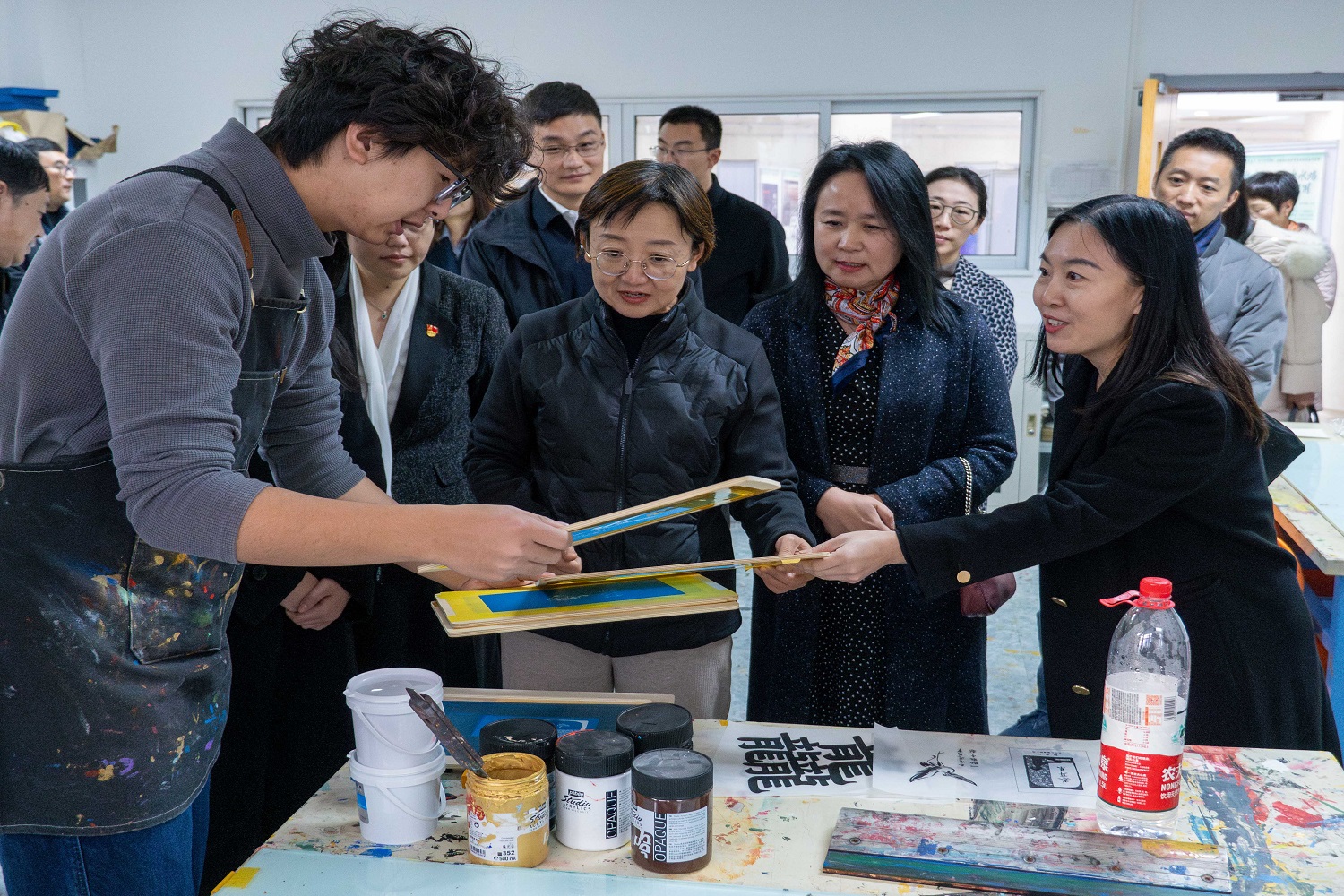 调研组一行首先参观了数字未来中心,了解学校教育数字化转型建设和发展情况,并观看设计与艺术学院青年教师团队为房山区拍摄的文旅宣传片《房山上的文物》。认真听取介绍后,调研组来到设计与艺术学院,参观学院毕业设计展和丝网印刷、陶瓷工作室,并体验丝网印刷技术。