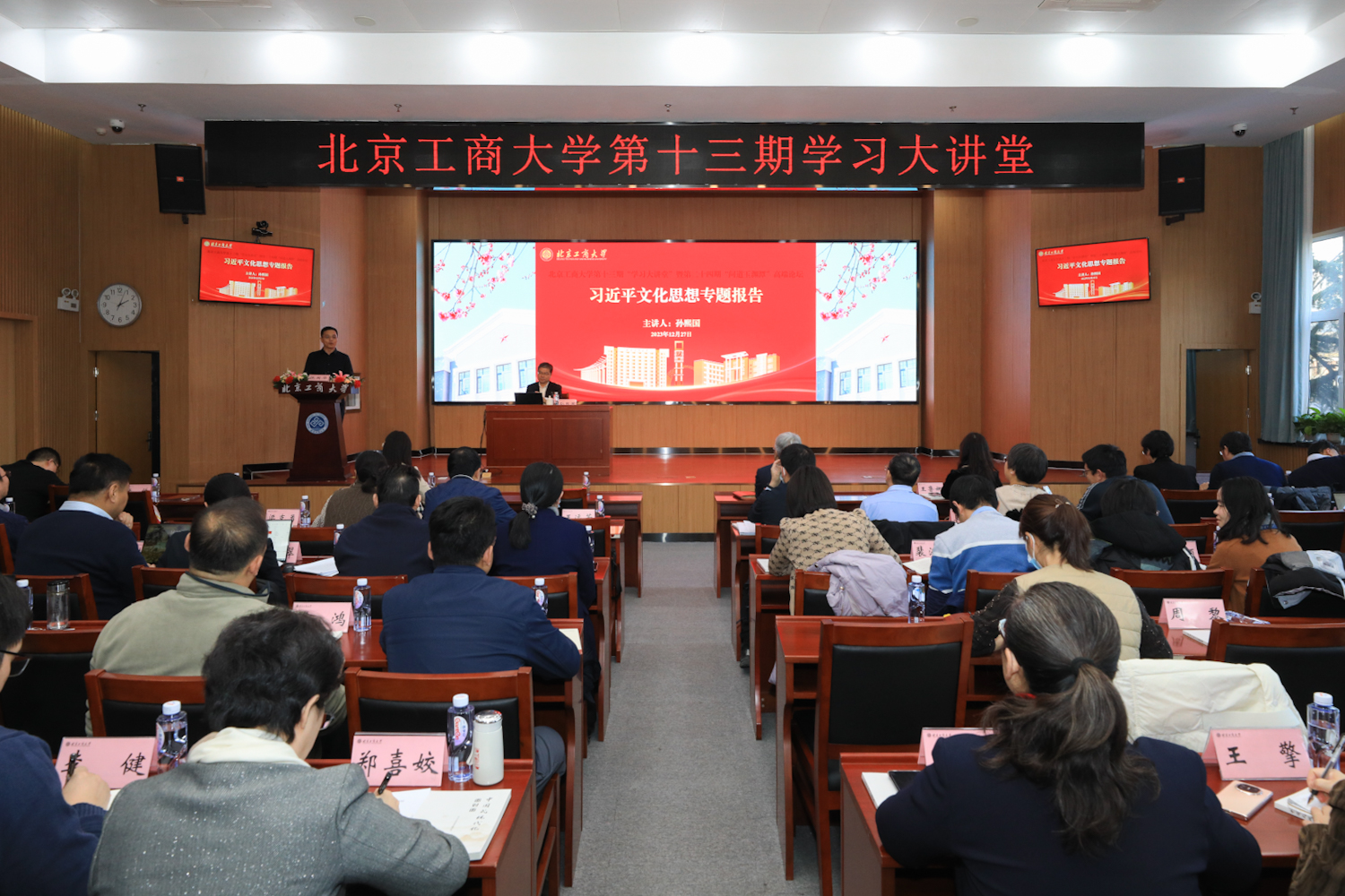 为深入学习贯彻习近平文化思想,进一步推动做好新时代新征程宣传思想文化工作,12月27日,学校举行“学习大讲堂”第十三期暨第二十四期“问道玉渊潭”高端论坛,邀请北京大学马克思主义学院孙熙国教授作题为“中华优秀传统文化的创造性转化与创新性发展”的辅导报告。学校党委副书记李中奇出席活动,讲座由校党委常委、党委宣传部部长倪国华主持。二级党委理论学习中心组成员、马克思主义学院师生、专职组织员、辅导员等200余人分别在两校区聆听报告。