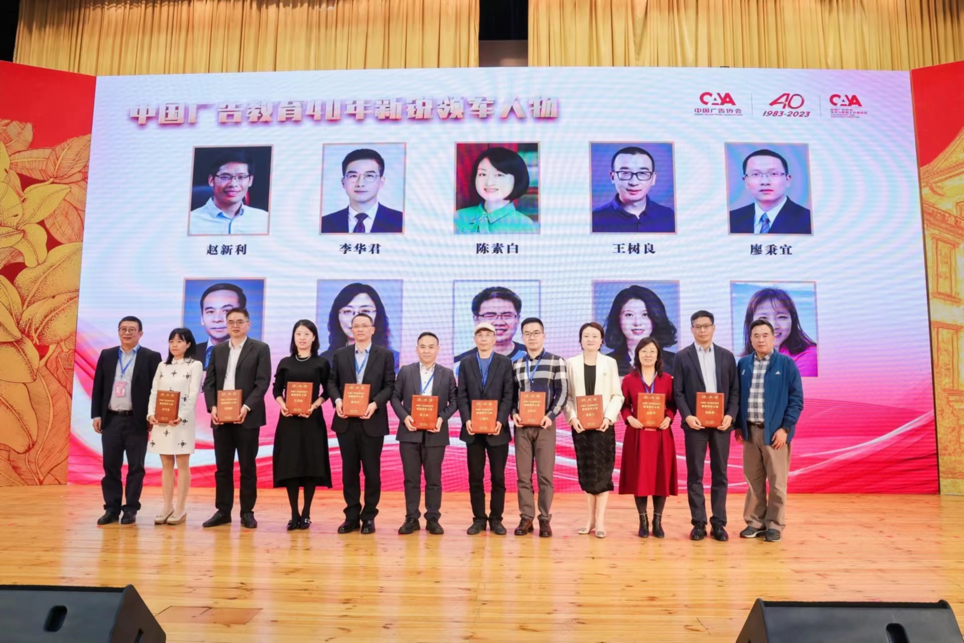 11月18日,由中国广告协会学术与教育工作委员会联合厦门大学新闻传播学院共同主办的“2023全国广告学术研讨会暨厦门大学广告学专业创办40周年庆”,在厦门大学科学艺术中心举行。中国广告协会秘书长王英偶发布“中国广告教育40年发展光荣榜”,我校广告学系三代学科带头人入选,潘大钧教授入选“中国广告教育40年致敬人物”,罗子明教授入选“中国广告教育40年突出贡献人物”,高丽华教授入选“中国广告教育40年新锐领军人物”。
