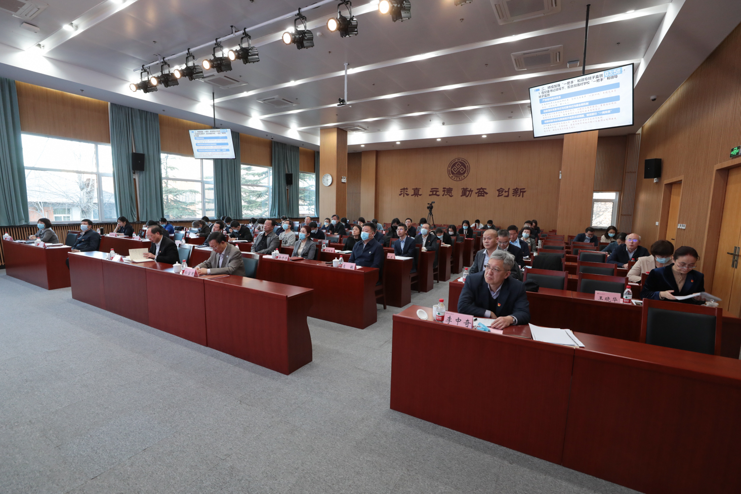 1月17日,学校在阜成路校区召开2021年度中层领导班子述职会。校领导黄先开、孙宝国、王伟、李中奇、欧阳媛、郑文红、徐丹丹、刘敏华、左敏出席会议。全体党政管理部门、群团组织、教辅单位负责人和教学单位行政负责人现场参会。会议由学校党委副书记王伟主持。