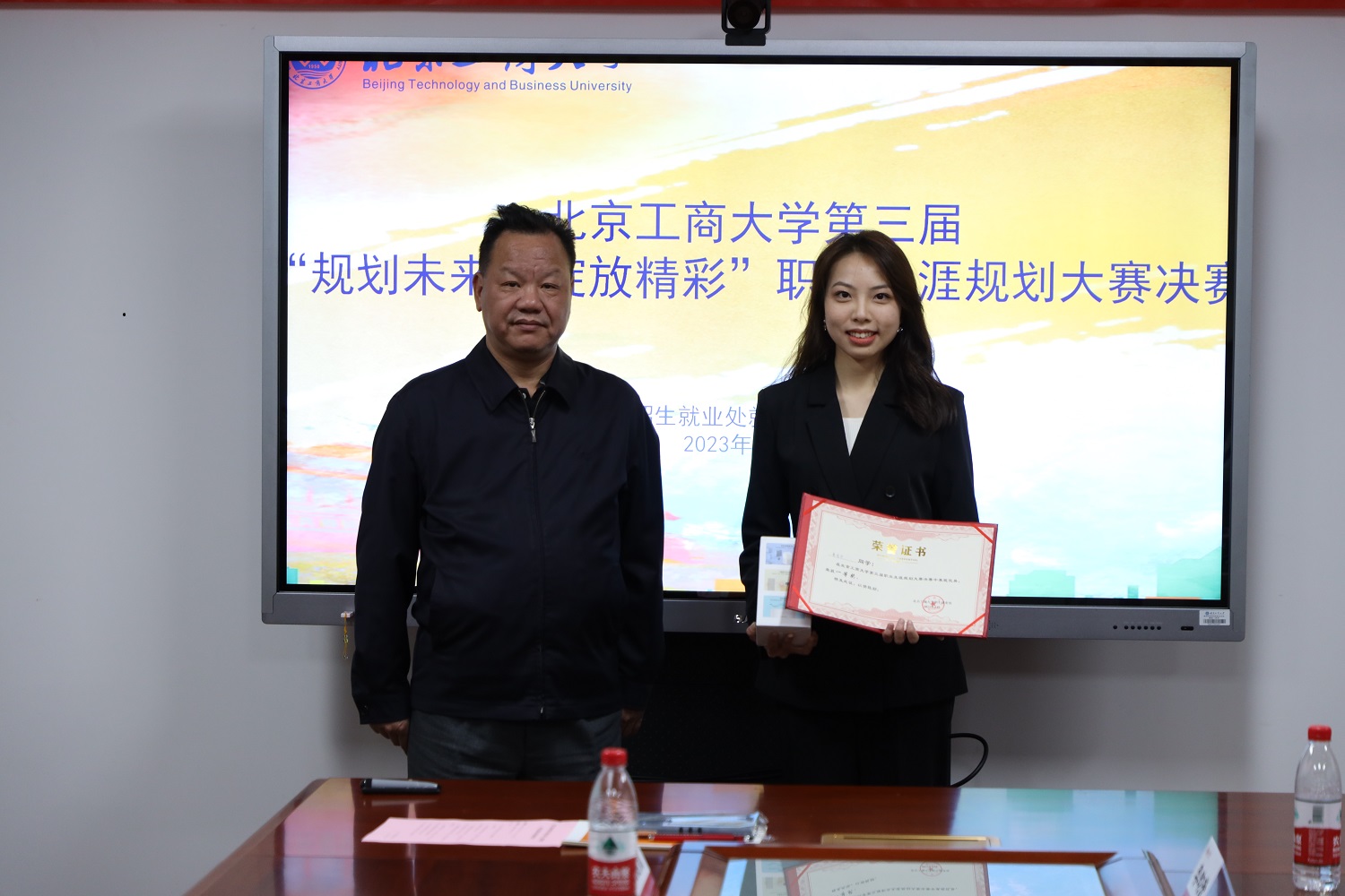本次大赛自2020年至今已举办三届,赛事紧密结合必修就业课程职业生涯规划的教学任务开展,由各学院任课教师选拔报送优秀的职业生涯规划书参赛,大赛共收到278份生涯规划书,经材料审核和初赛选拔出24位选手进入复赛,经过复赛的两场比拼遴选出10名选手进入决赛。大赛特邀教育部学生服务与素质发展中心特聘专家王洁颖、北京理工大学就业指导中心主任助理田静、北京京房众联劳务派遣有限公司总经理王楠、北京工商大学研工部教师李昀澄担任评委。十位参赛同学经过生涯陈述、回答评委提问、生涯主题卡答题等环节的激烈角逐,商学院注会214的姜俊宇同学获得了一等奖。