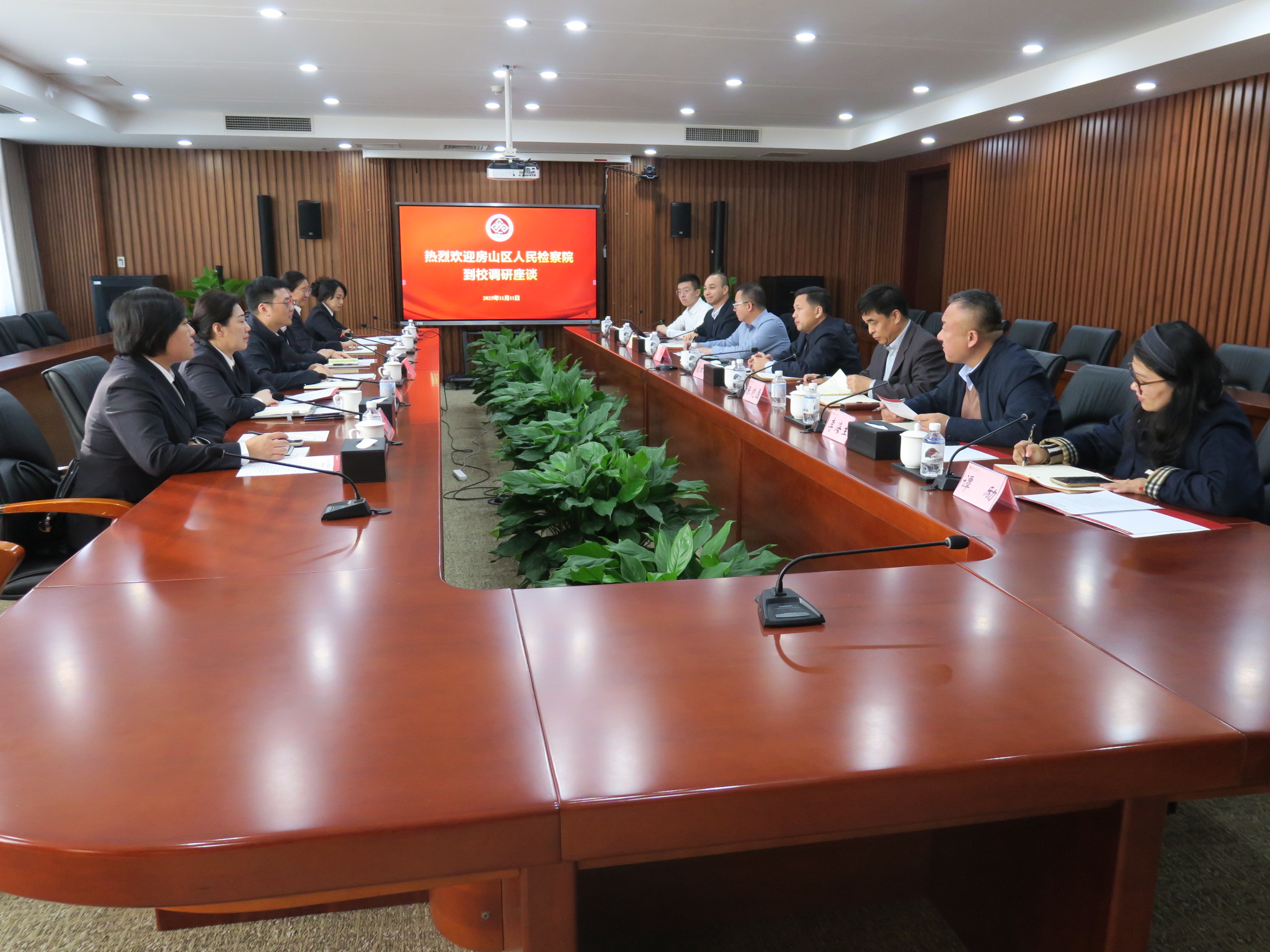 为深化检校合作,以数字科技赋能法治建设与人才培养,更好地服务区域经济社会高质量发展,11月11日下午,房山区人民检察院党组书记、检察长杜邈带队,党组副书记、副检察长王延文及相关部门负责人一行来到学校良乡校区开展调研座谈。学校党委常委、副校长寇红江,国内交流与合作处处长张晓磊,法学院、计算机与人工智能学院有关负责同志参加座谈。座谈会由党委常委、副校长寇红江主持。