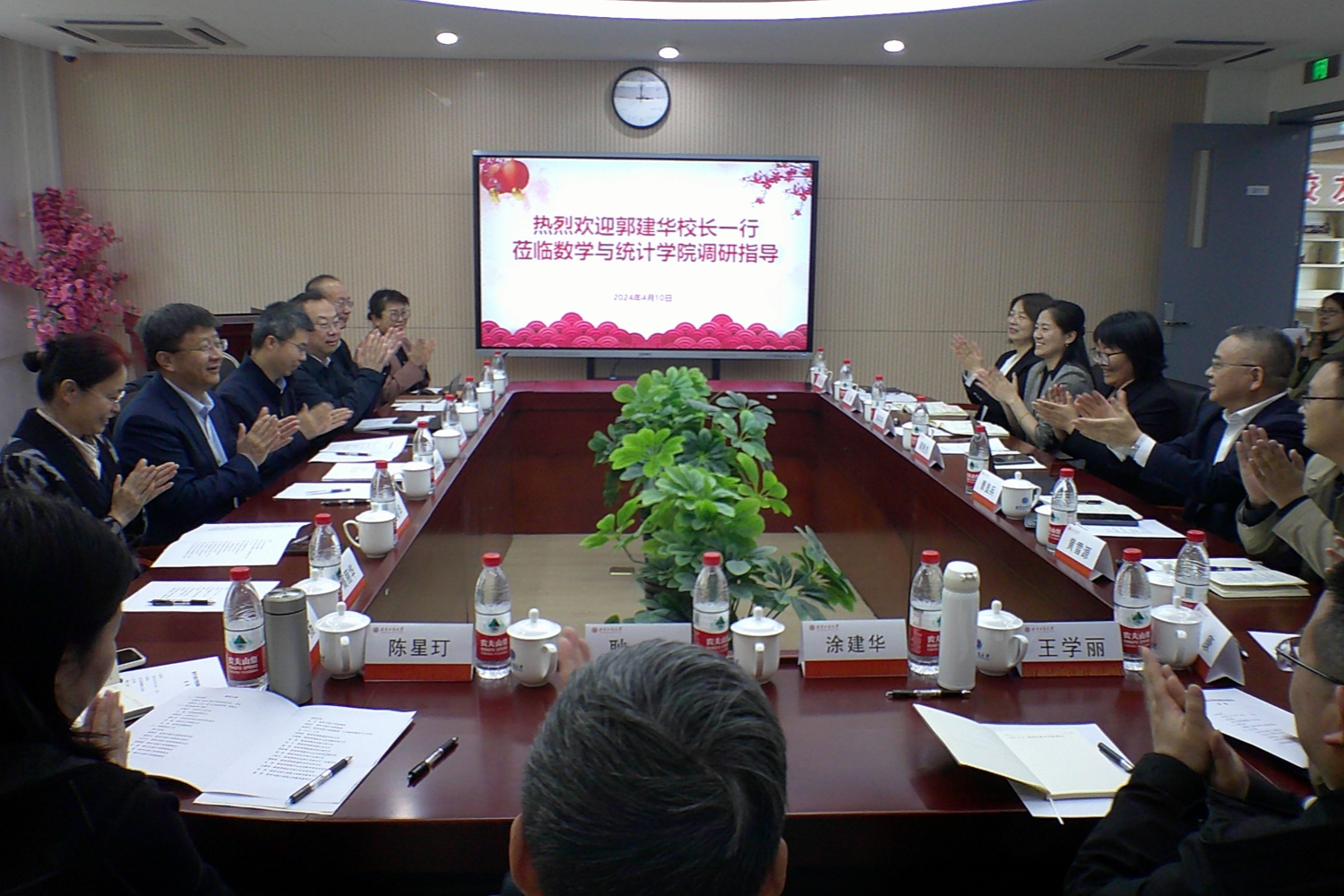 4月10日下午,学校党委副书记、校长郭建华,党委常委、副校长毛新述带队到数学与统计学院调研指导,就学院事业发展、学科建设、科学研究等方面与学院班子成员、教师代表座谈交流。学校党政办公室主任王晓华、发展规划处处长吉涛、科学研究院自然科学处处长钱立军、党政办公室副主任张扬、研究生院副院长张倩、数学与统计学院全体班子成员、系主任及教授代表参加调研座谈会。会议由学院党委书记周艳杰主持。