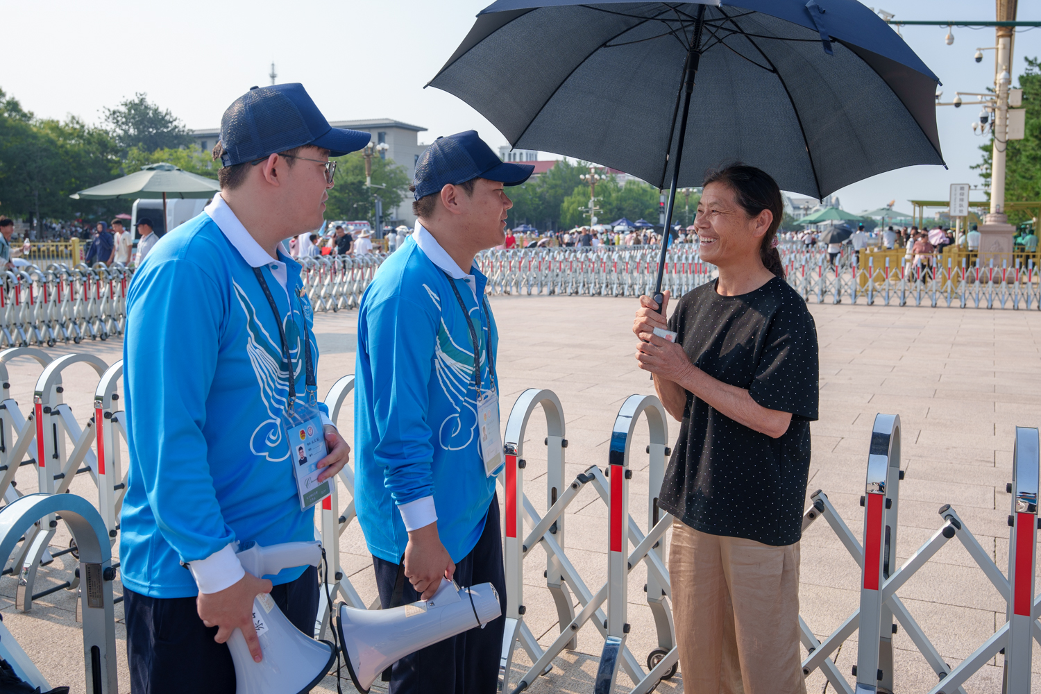 每日凌晨5点,志愿者们迎着旭日整装集结,7点前准时奔赴扶老助残、预约指导、解疑答惑、秩序维护、献花引导等14个不同的服务岗位。在烈日炎炎的八月盛夏,室外高温炙烤,志愿者们的衣服虽被汗水浸透,但他们在各自的岗位上始终如一,为来自五湖四海的瞻仰群众提供暖心、细致、周到的服务:一丝不苟地维护现场秩序,认真细致地解答群众疑问,悉心搀扶步履蹒跚的老人,全力协助残障人士上下轮椅……成为天安门广场上一道亮丽的风景线,也生动展现了新时代首都志愿者的良好风貌。